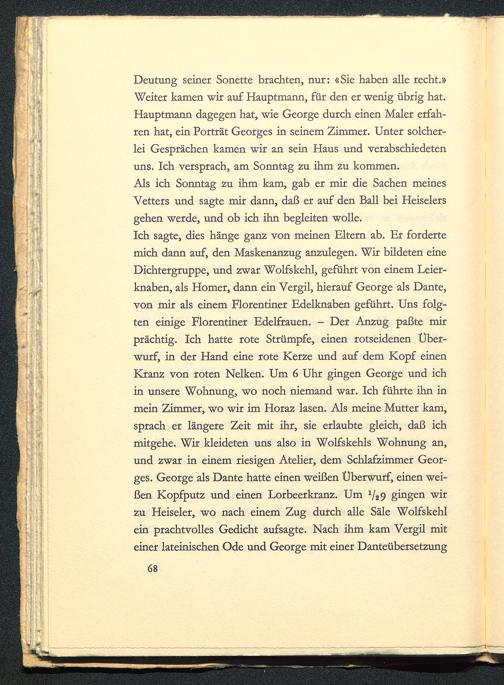 Deutung seiner Sonette brachten, nur: «Sie haben alle recht.»Weiter kamen wir auf Hauptmann, für den er wenig übrig hat.Hauptmann dagegen hat, wie George durch einen Maler erfah-ren hat, ein Porträt Georges in seinem Zimmer. Unter solcher-lei Gesprächen kamen wir an sein Haus und verabschiedetenuns. Ich versprach, am Sonntag zu ihm zu kommen.Als ich Sonntag zu ihm kam, gab er mir die Sachen meinesVetters und sagte mir dann, daß er auf den Ball bei Heiselersgehen werde, und ob ich ihn begleiten wolle.Ich sagte, dies hänge ganz von meinen Eltern ab. Er fordertemich dann auf, den Maskenanzug anzulegen. Wir bildeten eineDichtergruppe, und zwar Wolfskehl, geführt von einem Leier-knaben, als Homer, dann ein Vergil, hierauf George als Dante ,von mir als einem Florentiner Edelknaben geführt. Uns folg-ten einige Florentiner Edelfrauen. - Der Anzug paßte mirprächtig. Ich hatte rote Strümpfe, einen rotseidenen Uber-wurf, in der Hand eine rote Kerze und auf dem Kopf einenKranz von roten Nelken. Um 6 Uhr gingen George und ichin unsere Wohnung, wo noch niemand war. Ich führte ihn inmein Zimmer, wo wir im Horaz lasen. Als meine Mutter kam,sprach er längere Zeit mit ihr, sie erlaubte gleich, daß ichmitgehe. Wir kleideten uns also in Wolfskehls Wohnung an,und zwar in einem riesigen Atelier, dem Schlafzimmer Geor-ges. George als Dante hatte einen weißen Uberwurf, einen wei-ßen Kopfputz und einen Lorbeerkranz. Um 1 / 2 9 gingen wirzu Heiseler, wo nach einem Zug durch alle Säle Wolfskehlein prachtvolles Gedicht aufsagte. Nach ihm kam Vergil miteiner lateinischen Ode und George mit einer Danteübersetzung