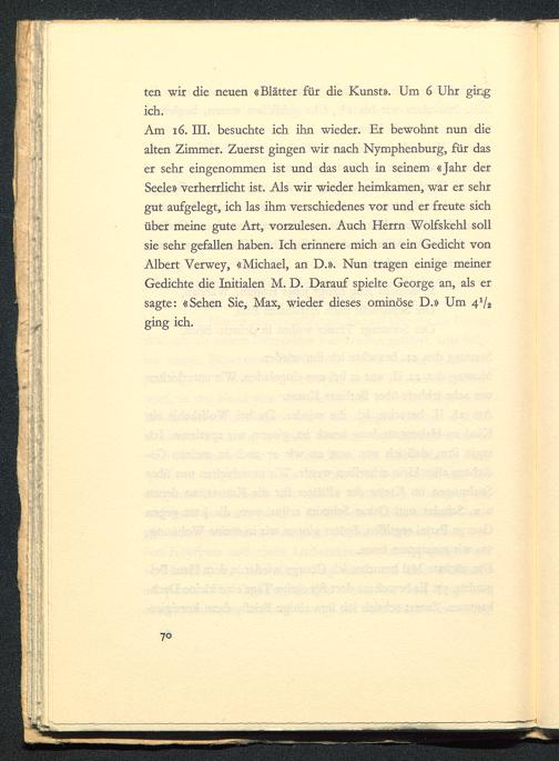 Am 16. III. besuchte ich ihn wieder. Er bewohnt nun diealten Zimmer. Zuerst gingen wir nach Nymphenburg, für daser sehr eingenommen ist und das auch in seinem «Jahr derSeele» verherrlicht ist. Als wir wieder heimkamen, war er sehrgut aufgelegt, ich las ihm verschiedenes vor und er freute sichüber meine gute Art, vorzulesen. Auch Herrn Wolfskehl sollsie sehr gefallen haben. Ich erinnere mich an ein Gedicht vonAlbert Verwey , «Michael, an D.». Nun tragen einige meinerGedichte die Initialen M. D. Darauf spielte George an, als ersagte: «Sehen Sie, Max, wieder dieses ominöse D.» Um 4V2ging ich.