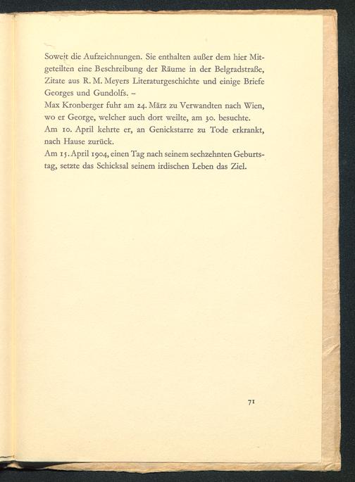 Soweit die Aufzeichnungen. Sie enthalten außer dem hier Mit-geteilten eine Beschreibung der Räume in der Belgradstraße,Zitate aus R. M. Meyers Literaturgeschichte und einige BriefeGeorges und Gundolfs. -