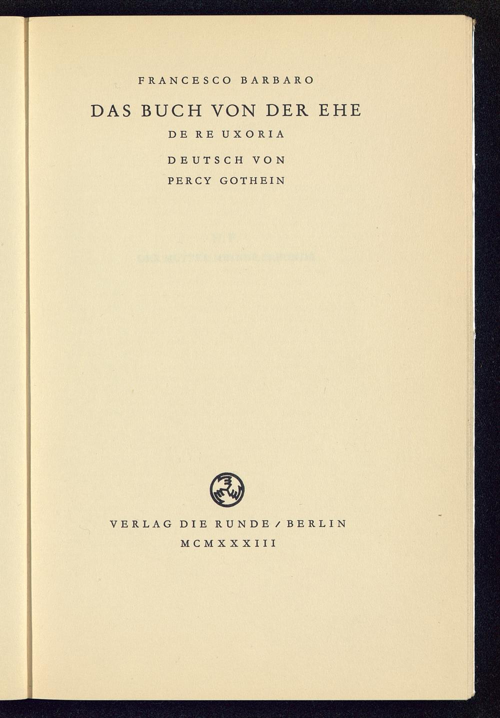 FRANCESCO BARBARO DAS BUCH VON DER EHEDE RE UXORIADEUTSCH VONPERCY GOTHEIN VERLAG DIE RUNDE / BERLIN MCMXXXIII