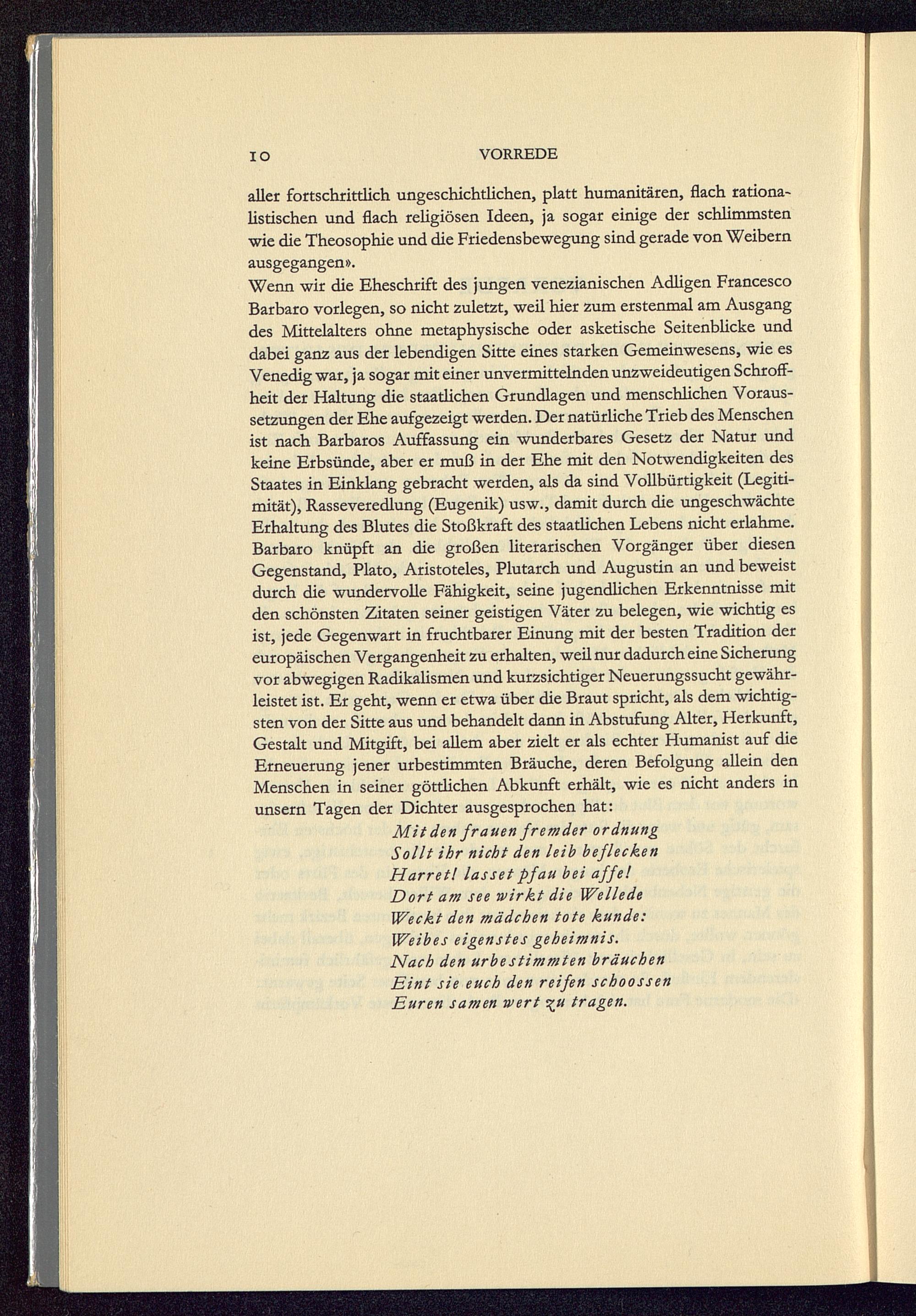 Wenn wir die Eheschrift des jungen venezianischen Adligen FrancescoBarbaro vorlegen, so nicht zuletzt, weil hier zum erstenmal am Ausgangdes Mittelalters ohne metaphysische oder asketische Seitenblicke unddabei ganz aus der lebendigen Sitte eines starken Gemeinwesens, wie esVenedig war, ja sogar mit einer unvermittelnden unzweideutigen Schroff-heit der Haltung die staatlichen Grundlagen und menschlichen Voraus-setzungen der Ehe aufgezeigt werden. Der natürliche Trieb des Menschenist nach Barbaros Auffassung ein wunderbares Gesetz der Natur undkeine Erbsünde, aber er muß in der Ehe mit den Notwendigkeiten desStaates in Einklang gebracht werden, als da sind Vollbürtigkeit (Legiti-mität), Rasseveredlung (Eugenik) usw., damit durch die ungeschwächteErhaltung des Blutes die Stoßkraft des staatlichen Lebens nicht erlahme.Barbaro knüpft an die großen literarischen Vorgänger über diesenGegenstand, Plato, Aristoteles, Plutarch und Augustin an und beweistdurch die wundervolle Fähigkeit, seine jugendlichen Erkenntnisse mitden schönsten Zitaten seiner geistigen Väter zu belegen, wie wichtig esist, jede Gegenwart in fruchtbarer Einung mit der besten Tradition dereuropäischen Vergangenheit zu erhalten, weil nur dadurch eine Sicherungvor abwegigen Radikalismen und kurzsichtiger Neuerungssucht gewähr-leistet ist. Er geht, wenn er etwa über die Braut spricht, als dem wichtig-sten von der Sitte aus und behandelt dann in Abstufung Alter, Herkunft,Gestalt und Mitgift, bei allem aber zielt er als echter Humanist auf dieErneuerung jener urbestimmten Bräuche, deren Befolgung allein denMenschen in seiner göttlichen Abkunft erhält, wie es nicht anders inunsern Tagen der Dichter ausgesprochen hat: