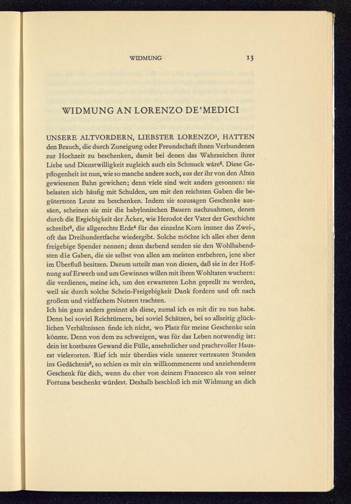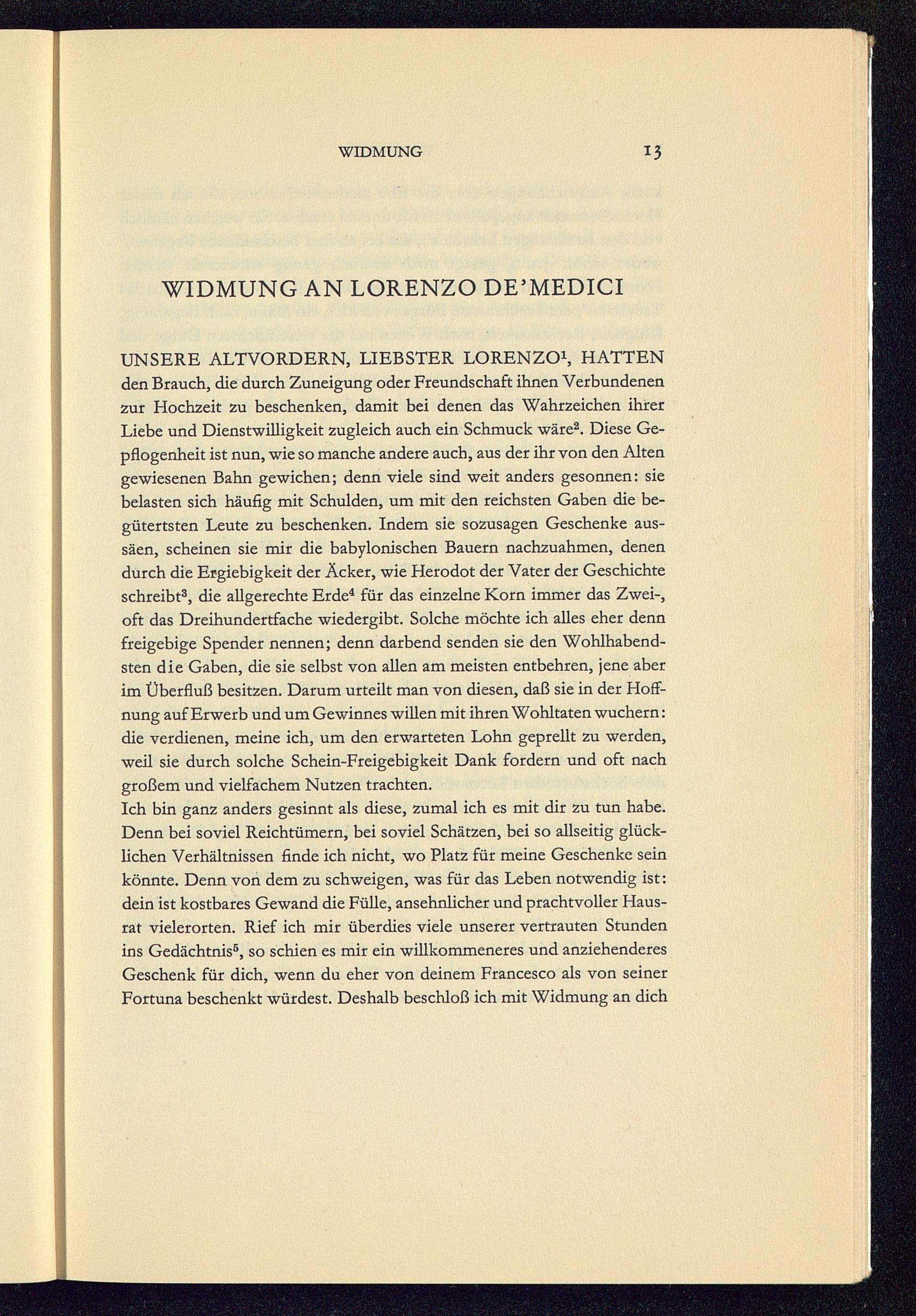 Ich bin ganz anders gesinnt als diese, zumal ich es mit dir zu tun habe.Denn bei soviel Reichtümern, bei soviel Schätzen, bei so allseitig glück-lichen Verhältnissen finde ich nicht, wo Platz für meine Geschenke seinkönnte. Denn von dem zu schweigen, was für das Leben notwendig ist:dein ist kostbares Gewand die Fülle, ansehnlicher und prachtvoller Haus-rat vielerorten. Rief ich mir überdies viele unserer vertrauten Stundenins Gedächtnis 5 , so schien es mir ein willkommeneres und anziehenderesGeschenk für dich, wenn du eher von deinem Francesco als von seinerFortuna beschenkt würdest. Deshalb beschloß ich mit Widmung an dich
