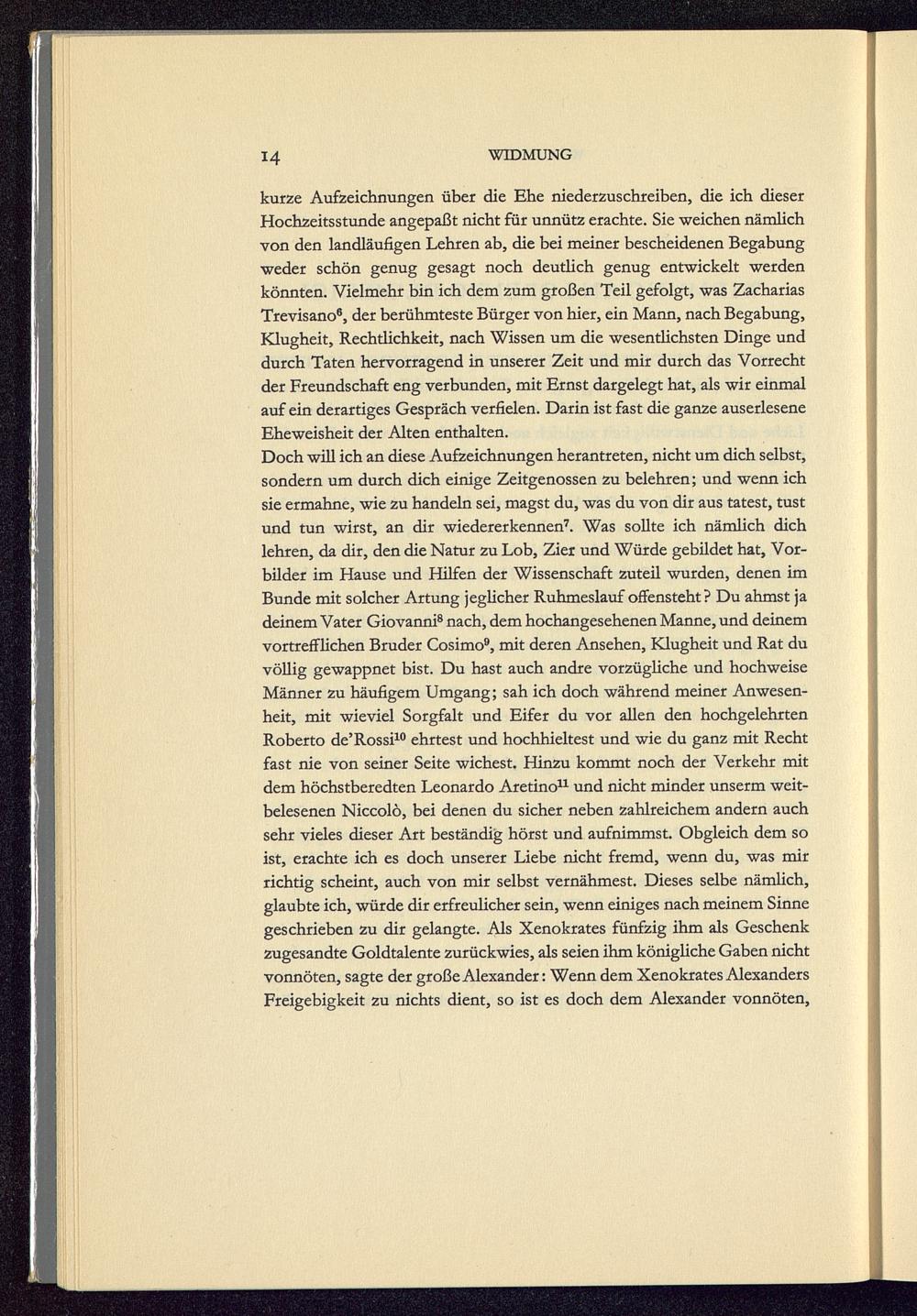 Doch will ich an diese Aufzeichnungen herantreten, nicht um dich selbst,sondern um durch dich einige Zeitgenossen zu belehren; und wenn ichsie ermahne, wie zu handeln sei, magst du, was du von dir aus tatest, tustund tun wirst, an dir wiedererkennen 7 . Was sollte ich nämlich dichlehren, da dir, den die Natur zu Lob, Zier und Würde gebildet hat, Vor-bilder im Hause und Hilfen der Wissenschaft zuteil wurden, denen imBunde mit solcher Artung jeglicher Ruhmeslauf offensteht? Du ahmst jadeinem Vater Giovanni 8 nach, dem hochangesehenen Manne, und deinemvortrefflichen Bruder Cosimo 9 , mit deren Ansehen, Klugheit und Rat duvöllig gewappnet bist. Du hast auch andre vorzügliche und hochweiseMänner zu häufigem Umgang; sah ich doch während meiner Anwesen-heit, mit wieviel Sorgfalt und Eifer du vor allen den hochgelehrtenRoberto de'Rossi 10 ehrtest und hochhieltest und wie du ganz mit Rechtfast nie von seiner Seite wichest. Hinzu kommt noch der Verkehr mitdem höchstberedten Leonardo Aretino 11 und nicht minder unserm weit-belesenen Niccolö, bei denen du sicher neben zahlreichem andern auchsehr vieles dieser Art beständig hörst und aufnimmst. Obgleich dem soist, erachte ich es doch unserer Liebe nicht fremd, wenn du, was mirrichtig scheint, auch von mir selbst vernähmest. Dieses selbe nämlich,glaubte ich, würde dir erfreulicher sein, wenn einiges nach meinem Sinnegeschrieben zu dir gelangte. Als Xenokrates fünfzig ihm als Geschenkzugesandte Goldtalente zurückwies, als seien ihm königliche Gaben nichtvonnöten, sagte der große Alexander: Wenn dem Xenokrates AlexandersFreigebigkeit zu nichts dient, so ist es doch dem Alexander vonnöten,