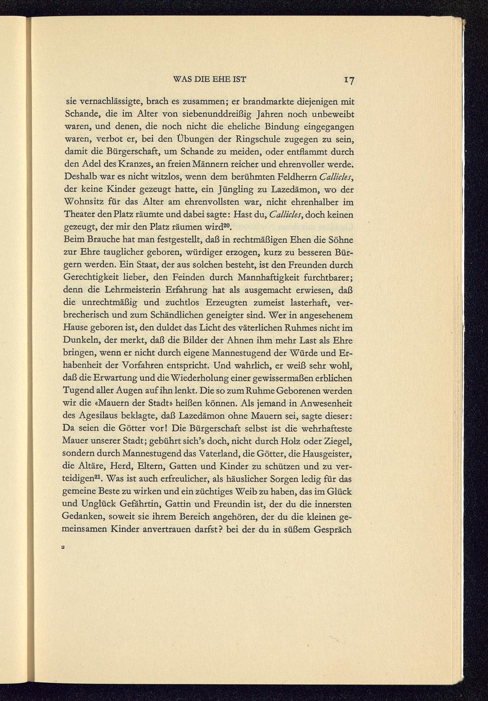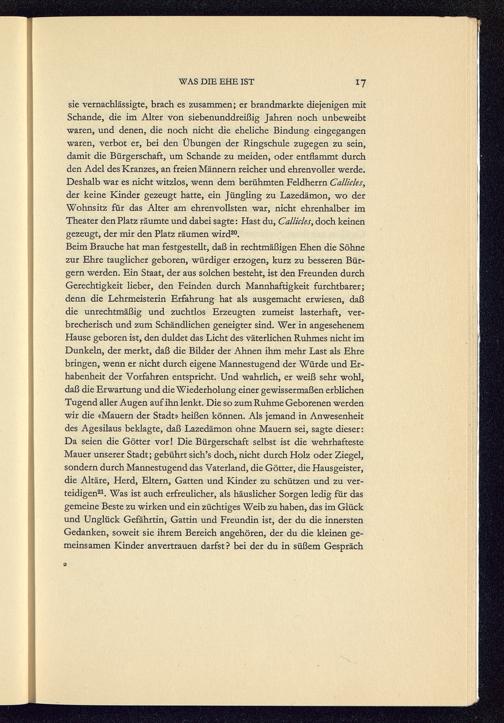Beim Brauche hat man festgestellt, daß in rechtmäßigen Ehen die Söhnezur Ehre tauglicher geboren, würdiger erzogen, kurz zu besseren Bür-gern werden. Ein Staat, der aus solchen besteht, ist den Freunden durchGerechtigkeit Heber, den Feinden durch Mannhaftigkeit furchtbarer;denn die Lehrmeisterin Erfahrung hat als ausgemacht erwiesen, daßdie unrechtmäßig und zuchtlos Erzeugten zumeist lasterhaft, ver-brecherisch und zum Schändlichen geneigter sind. Wer in angesehenemHause geboren ist, den duldet das Licht des väterlichen Ruhmes nicht imDunkeln, der merkt, daß die Bilder der Ahnen ihm mehr Last als Ehrebringen, wenn er nicht durch eigene Mannestugend der Würde und Er-habenheit der Vorfahren entspricht. Und wahrlich, er weiß sehr wohl,daß die Erwartung und die Wiederholung einer gewissermaßen erblichenTugend aller Augen auf ihn lenkt. Die so zum Ruhme Geborenen werdenwir die «Mauern der Stadt» heißen können. Als jemand in Anwesenheitdes Agesilaus beklagte, daß Lazedämon ohne Mauern sei, sagte dieser:Da seien die Götter vor! Die Bürgerschaft selbst ist die wehrhaftesteMauer unserer Stadt; gebührt sich's doch, nicht durch Holz oder Ziegel,sondern durch Mannestugend das Vaterland, die Götter, die Hausgeister,die Altäre, Herd, Eltern, Gatten und Kinder zu schützen und zu ver-teidigen 21 . Was ist auch erfreulicher, als häuslicher Sorgen ledig für dasgemeine Beste zu wirken und ein züchtiges Weib zu haben, das im Glückund Unglück Gefährtin, Gattin und Freundin ist, der du die innerstenGedanken, soweit sie ihrem Bereich angehören, der du die kleinen ge-meinsamen Kinder anvertrauen darfst? bei der du in süßem Gespräch