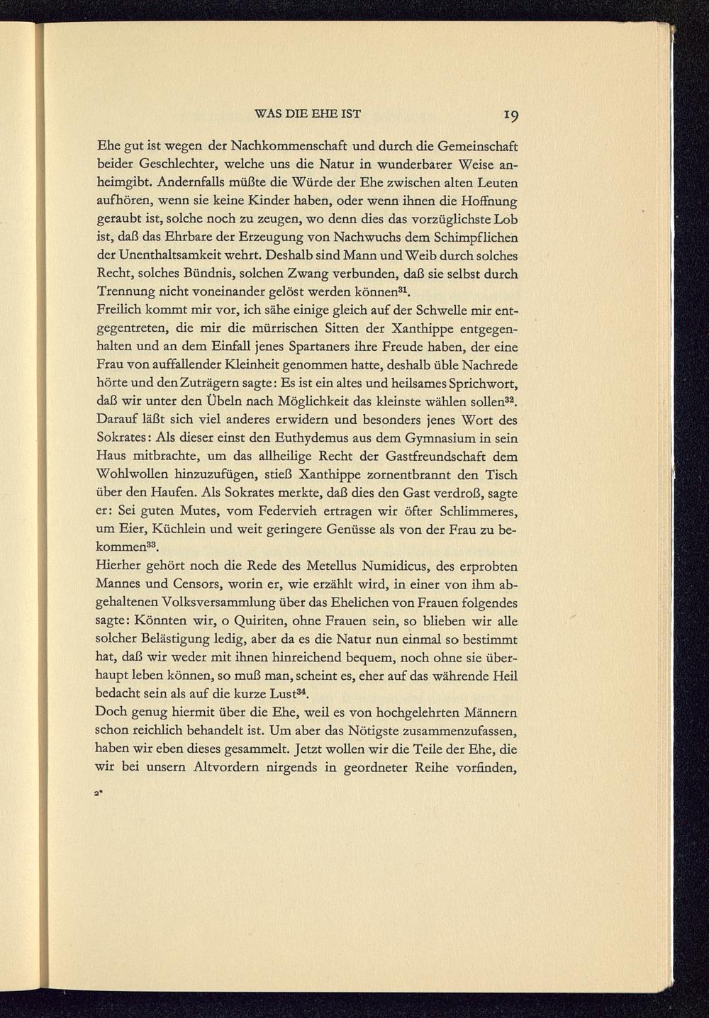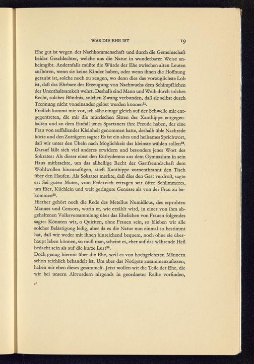 Ehe gut ist wegen der Nachkommenschaft und durch die Gemeinschaftbeider Geschlechter, welche uns die Natur in wunderbarer Weise an-heimgibt. Andernfalls müßte die Würde der Ehe zwischen alten Leutenaufhören, wenn sie keine Kinder haben, oder wenn ihnen die Hoffnunggeraubt ist, solche noch zu zeugen, wo denn dies das vorzüglichste Lobist, daß das Ehrbare der Erzeugung von Nachwuchs dem Schimpflichender Unenthaltsamkeit wehrt. Deshalb sind Mann und Weib durch solchesRecht, solches Bündnis, solchen Zwang verbunden, daß sie selbst durchTrennung nicht voneinander gelöst werden können 31 .Freilich kommt mir vor, ich sähe einige gleich auf der Schwelle mir ent-gegentreten, die mir die mürrischen Sitten der Xanthippe entgegen-halten und an dem Einfall jenes Spartaners ihre Freude haben, der eineFrau von auffallender Kleinheit genommen hatte, deshalb üble Nachredehörte und den Zuträgern sagte: Es ist ein altes und heilsames Sprichwort,daß wir unter den Übeln nach Möglichkeit das kleinste wählen sollen 32 .Darauf läßt sich viel anderes erwidern und besonders jenes Wort desSokrates: Als dieser einst den Euthydemus aus dem Gymnasium in seinHaus mitbrachte, um das allheilige Recht der Gastfreundschaft demWohlwollen hinzuzufügen, stieß Xanthippe zornentbrannt den Tischüber den Haufen. Als Sokrates merkte, daß dies den Gast verdroß, sagteer: Sei guten Mutes, vom Federvieh ertragen wir öfter Schlimmeres,um Eier, Küchlein und weit geringere Genüsse als von der Frau zu be-kommen 33 .
