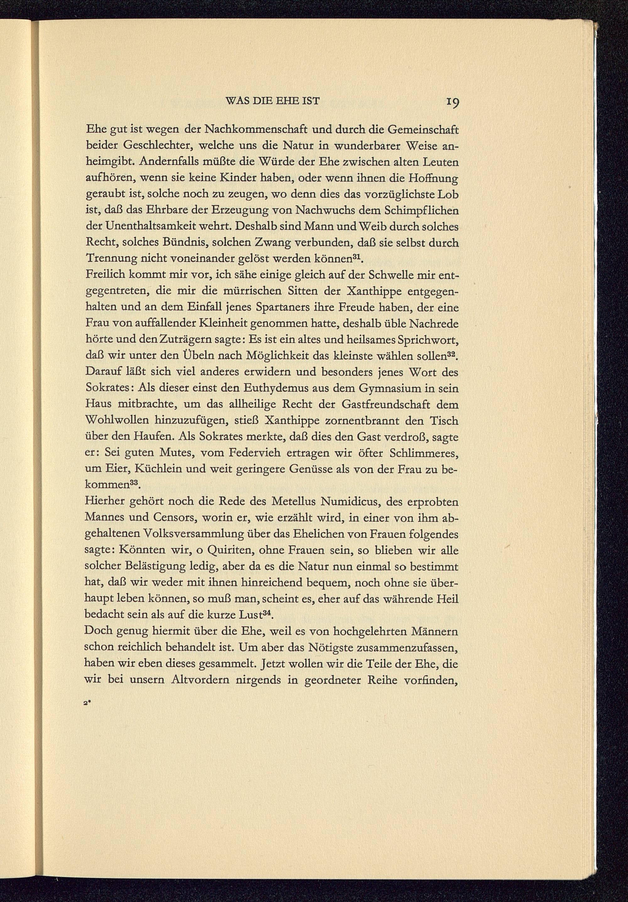 Hierher gehört noch die Rede des Metellus Numidicus , des erprobtenMannes und Censors, worin er, wie erzählt wird, in einer von ihm ab-gehaltenen Volksversammlung über das Ehelichen von Frauen folgendessagte: Könnten wir, o Quiriten, ohne Frauen sein, so blieben wir allesolcher Belästigung ledig, aber da es die Natur nun einmal so bestimmthat, daß wir weder mit ihnen hinreichend bequem, noch ohne sie über-haupt leben können, so muß man, scheint es, eher auf das währende Heilbedacht sein als auf die kurze Lust 34 .
