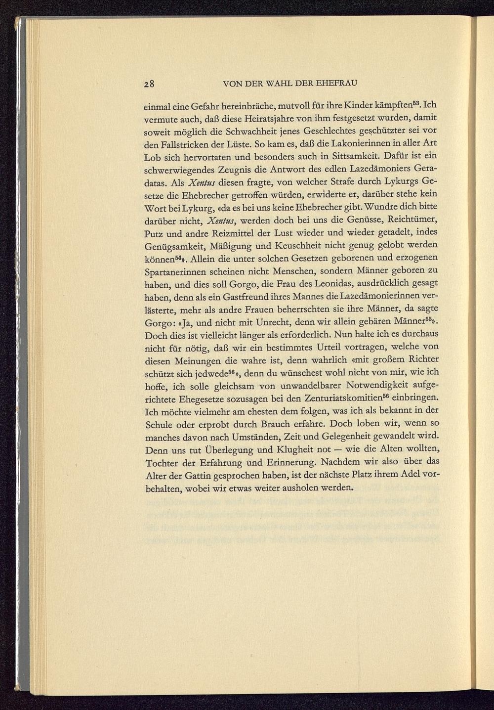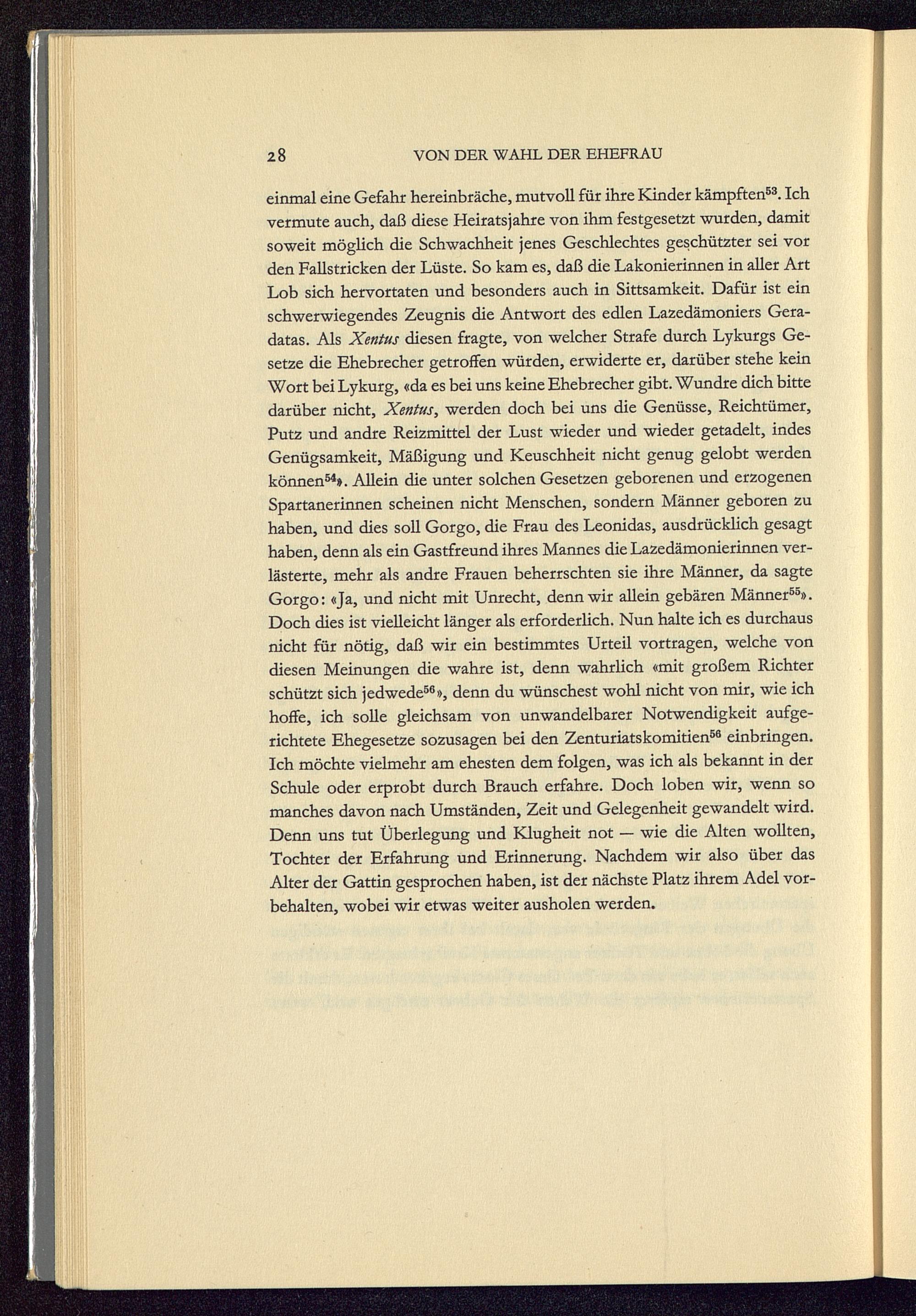 einmal eine Gefahr hereinbräche, mutvoll für ihre Kinder kämpften 53 . Ichvermute auch, daß diese Heirats jähre von ihm festgesetzt wurden, damitsoweit möglich die Schwachheit jenes Geschlechtes geschützter sei vorden Fallstricken der Lüste. So kam es, daß die Lakonierinnen in aller ArtLob sich hervortaten und besonders auch in Sittsamkeit. Dafür ist einschwerwiegendes Zeugnis die Antwort des edlen Lazedämoniers Gera -datas. Als Xentus diesen fragte, von welcher Strafe durch Lykurgs Ge-setze die Ehebrecher getroffen würden, erwiderte er, darüber stehe keinWort bei Lykurg, «da es bei uns keine Ehebrecher gibt. Wundre dich bittedarüber nicht, Xentus, werden doch bei uns die Genüsse, Reichtümer,Putz und andre Reizmittel der Lust wieder und wieder getadelt, indesGenügsamkeit, Mäßigung und Keuschheit nicht genug gelobt werdenkönnen 54 ». Allein die unter solchen Gesetzen geborenen und erzogenenSpartanerinnen scheinen nicht Menschen, sondern Männer geboren zuhaben, und dies soll Gorgo, die Frau des Leonidas , ausdrücklich gesagthaben, denn als ein Gastfreund ihres Mannes die Lazedämonierinnen ver-lästerte, mehr als andre Frauen beherrschten sie ihre Männer, da sagteGorgo: «Ja, und nicht mit Unrecht, denn wir allein gebären Männer 55 ».Doch dies ist vielleicht länger als erforderlich. Nun halte ich es durchausnicht für nötig, daß wir ein bestimmtes Urteil vortragen, welche vondiesen Meinungen die wahre ist, denn wahrlich «mit großem Richterschützt sich jedwede 58 », denn du wünschest wohl nicht von mir, wie ichhoffe, ich solle gleichsam von unwandelbarer Notwendigkeit aufge-richtete Ehegesetze sozusagen bei den Zenturiatskomitien 58 einbringen.Ich möchte vielmehr am ehesten dem folgen, was ich als bekannt in derSchule oder erprobt durch Brauch erfahre. Doch loben wir, wenn somanches davon nach Umständen, Zeit und Gelegenheit gewandelt wird.Denn uns tut Überlegung und Klugheit not — wie die Alten wollten,Tochter der Erfahrung und Erinnerung. Nachdem wir also über dasAlter der Gattin gesprochen haben, ist der nächste Platz ihrem Adel vor-behalten, wobei wir etwas weiter ausholen werden.