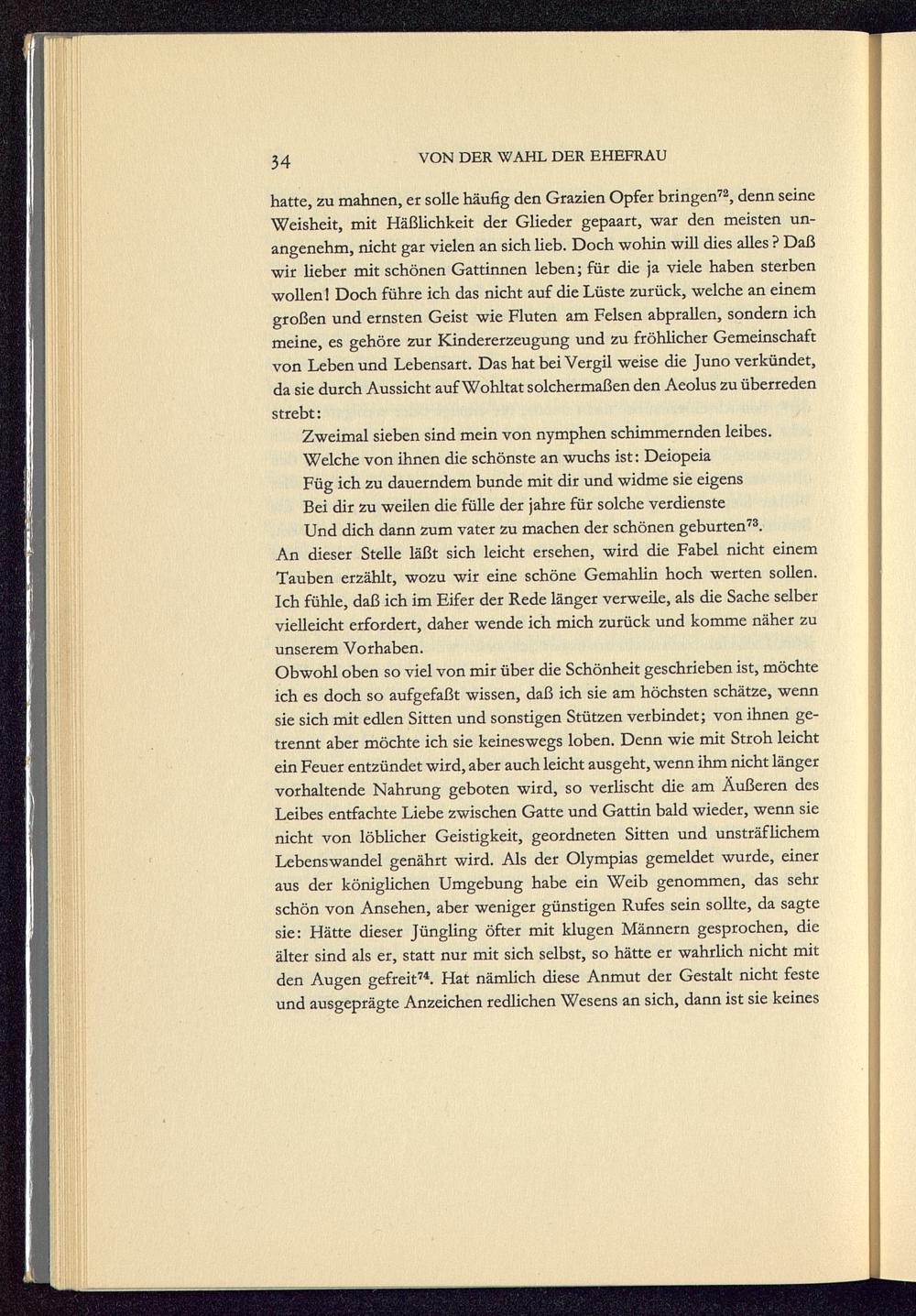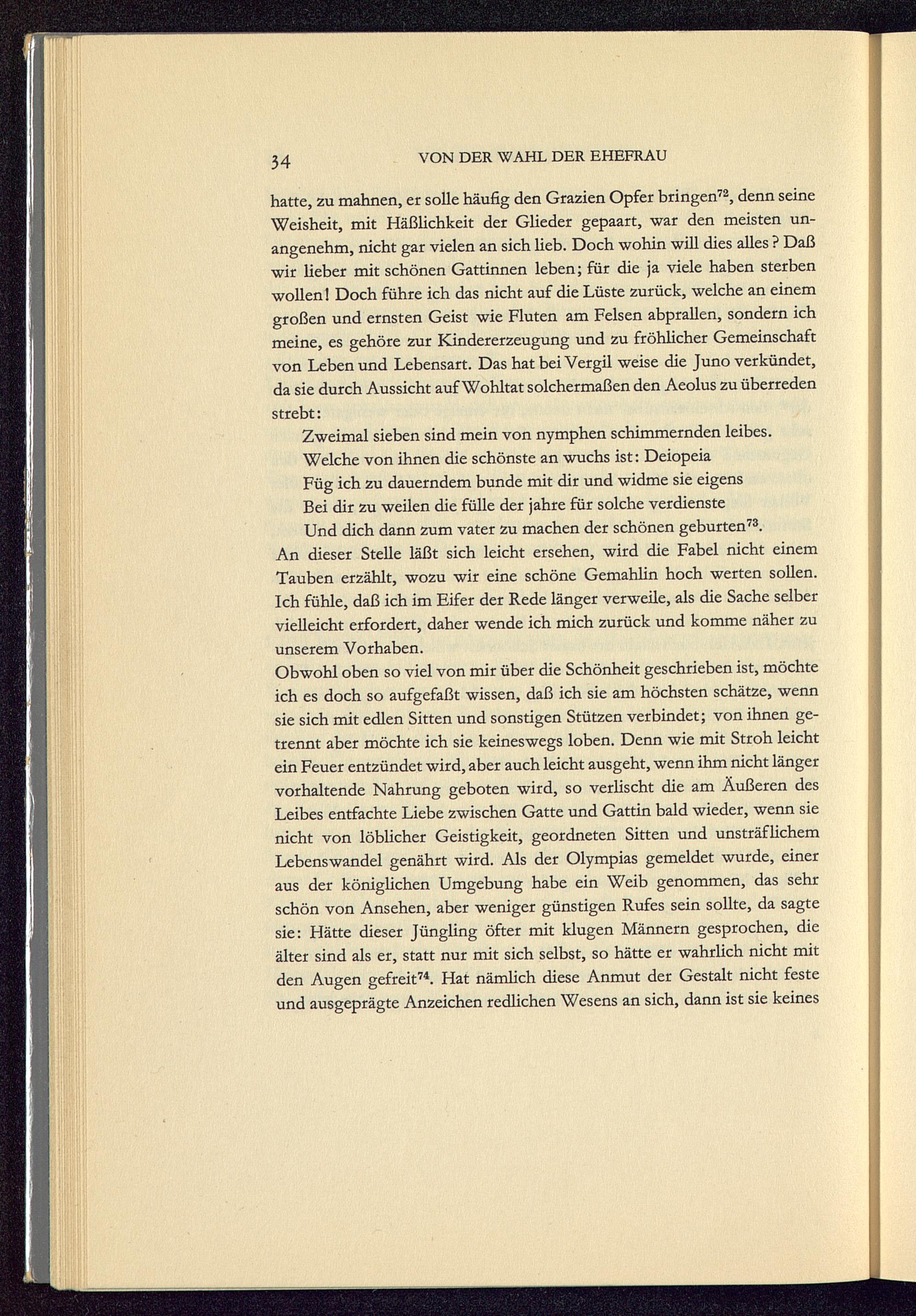 hatte, zu mahnen, er solle häufig den Grazien Opfer bringen 72 , denn seineWeisheit, mit Häßlichkeit der Glieder gepaart, war den meisten un-angenehm, nicht gar vielen an sich lieb. Doch wohin will dies alles ? Daßwir lieber mit schönen Gattinnen leben; für die ja viele haben sterbenwollen! Doch führe ich das nicht auf die Lüste zurück, welche an einemgroßen und ernsten Geist wie Fluten am Felsen abprallen, sondern ichmeine, es gehöre zur Kindererzeugung und zu fröhlicher Gemeinschaftvon Leben und Lebensart. Das hat bei Vergil weise die Juno verkündet,da sie durch Aussicht auf Wohltat solchermaßen den Aeolus zu überredenstrebt: