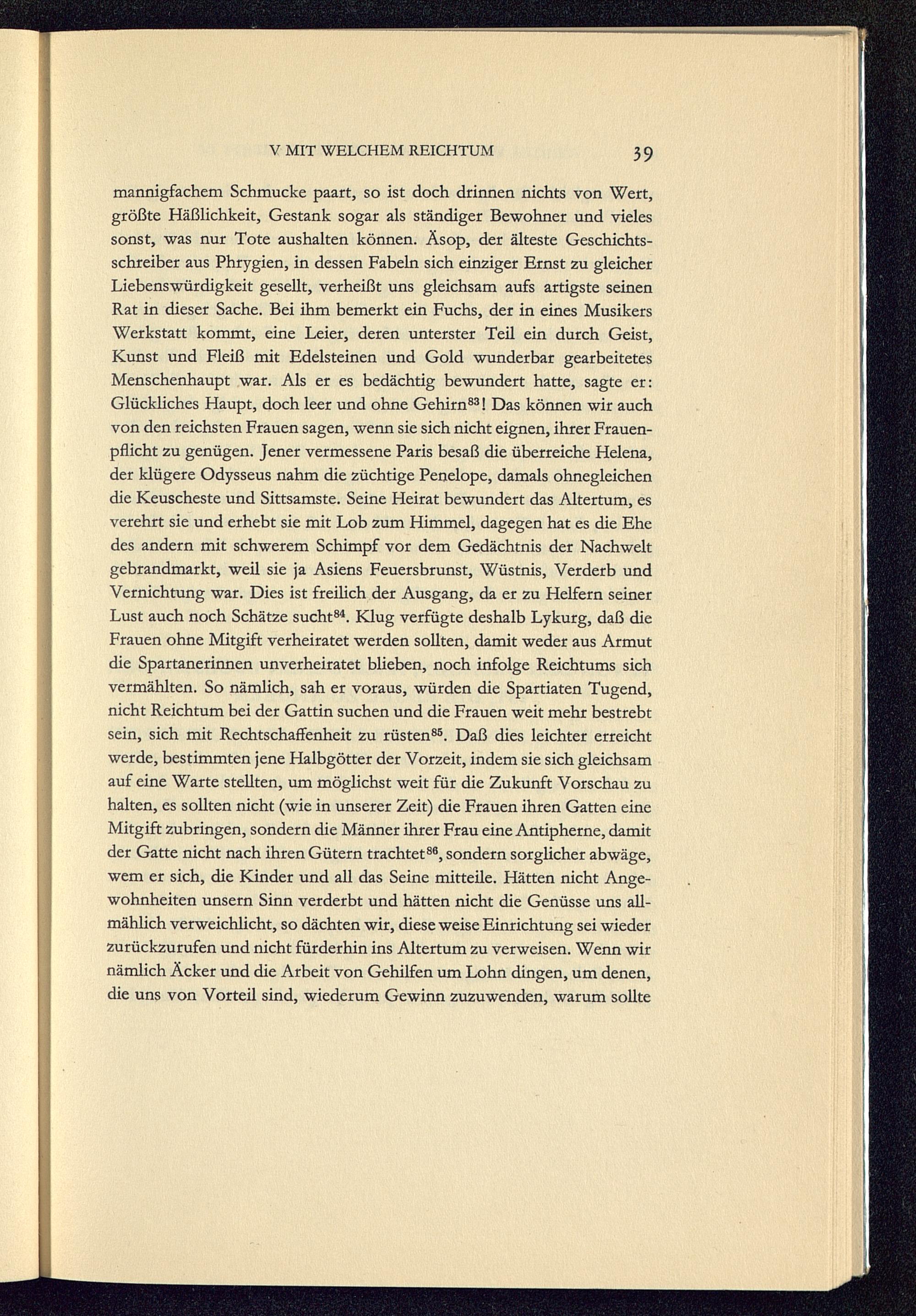 mannigfachem Schmucke paart, so ist doch drinnen nichts von Wert,größte Häßlichkeit, Gestank sogar als ständiger Bewohner und vielessonst, was nur Tote aushalten können. Äsop , der älteste Geschichts-schreiber aus Phrygien , in dessen Fabeln sich einziger Ernst zu gleicherLiebenswürdigkeit gesellt, verheißt uns gleichsam aufs artigste seinenRat in dieser Sache. Bei ihm bemerkt ein Fuchs, der in eines MusikersWerkstatt kommt, eine Leier, deren unterster Teil ein durch Geist,Kunst und Fleiß mit Edelsteinen und Gold wunderbar gearbeitetesMenschenhaupt war. Als er es bedächtig bewundert hatte, sagte er:Glückliches Haupt, doch leer und ohne Gehirn 83 ! Das können wir auchvon den reichsten Frauen sagen, wenn sie sich nicht eignen, ihrer Frauen-pflicht zu genügen. Jener vermessene Paris besaß die überreiche Helena,der klügere Odysseus nahm die züchtige Penelope, damals ohnegleichendie Keuscheste und Sittsamste. Seine Heirat bewundert das Altertum, esverehrt sie und erhebt sie mit Lob zum Himmel, dagegen hat es die Ehedes andern mit schwerem Schimpf vor dem Gedächtnis der Nachweltgebrandmarkt, weil sie ja Asiens Feuersbrunst, Wüstnis, Verderb undVernichtung war. Dies ist freilich der Ausgang, da er zu Helfern seinerLust auch noch Schätze sucht 84 . Klug verfügte deshalb Lykurg, daß dieFrauen ohne Mitgift verheiratet werden sollten, damit weder aus Armutdie Spartanerinnen unverheiratet blieben, noch infolge Reichtums sichvermählten. So nämlich, sah er voraus, würden die Spartiaten Tugend,nicht Reichtum bei der Gattin suchen und die Frauen weit mehr bestrebtsein, sich mit Rechtschaffenheit zu rüsten 85 . Daß dies leichter erreichtwerde, bestimmten jene Halbgötter der Vorzeit, indem sie sich gleichsamauf eine Warte stellten, um möglichst weit für die Zukunft Vorschau zuhalten, es sollten nicht (wie in unserer Zeit) die Frauen ihren Gatten eineMitgift zubringen, sondern die Männer ihrer Frau eine Antipherne, damitder Gatte nicht nach ihren Gütern trachtet 86 , sondern sorglicher abwäge,wem er sich, die Kinder und all das Seine mitteile. Hätten nicht Ange-wohnheiten unsern Sinn verderbt und hätten nicht die Genüsse uns all-mählich verweichlicht, so dächten wir, diese weise Einrichtung sei wiederzurückzurufen und nicht fürderhin ins Altertum zu verweisen. Wenn wirnämlich Äcker und die Arbeit von Gehilfen um Lohn dingen, um denen,die uns von Vorteil sind, wiederum Gewinn zuzuwenden, warum sollte