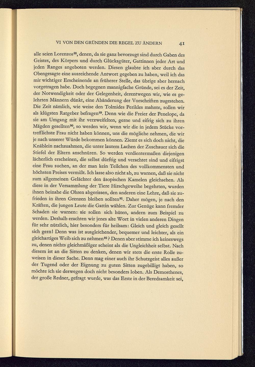 alle seien Lorenzos 88 , denen, da sie ganz bevorzugt sind durch Gaben desGeistes, des Körpers und durch Glücksgüter, Gattinnen jeder Art undjeden Ranges angeboten werden. Diesen glaubte ich aber durch dasObengesagte eine ausreichende Antwort gegeben zu haben, weil ich dasmir wichtiger Erscheinende an früherer Stelle, das übrige aber hernachvorgetragen habe. Doch begegnen mannigfache Gründe, sei es der Zeit,der Notwendigkeit oder der Gelegenheit, derentwegen wir, wie es ge-lehrten Männern dünkt, eine Abänderung der Vorschriften zugestehen.Die Zeit nämlich, wie weise den Tolmides Perikles mahnte, sollen wirals klügsten Ratgeber befragen 89 . Denn wie die Freier der Penelope, dasie am Umgang mit ihr verzweifelten, gerne und eifrig sich zu ihrenMägden gesellten 90 , so werden wir, wenn wir die in jedem Stücke vor-trefflichste Frau nicht haben können, uns die mögliche nehmen, die wirje nach unserer Würde bekommen können. Ziemt es sich doch nicht, dieKnäblein nachzuahmen, die unter lautem Lachen der Zuschauer sich dieStiefel der Eltern anschnüren. So werden verdientermaßen diejenigenlächerlich erscheinen, die selbst dürftig und verachtet sind und eifrigsteine Frau suchen, an der man kein Teilchen des vollkommensten undhöchsten Preises vermißt. Ich lasse also nicht ab, zu warnen, daß sie nichtzum allgemeinen Gelächter den äsopischen Kamelen gleichsehen. Alsdiese in der Versammlung der Tiere Hirschgeweihe begehrten, wurdenihnen beinahe die Ohren abgerissen, den anderen eine Lehre, daß sie zu-frieden in ihren Grenzen bleiben sollten 91 . Daher mögen, je nach denKräften, die jungen Leute die Gattin wählen. Zur Genüge kann fremderSchaden sie warnen: sie sollen sich hüten, andern zum Beispiel zuwerden. Deshalb erachten wir jenes alte Wort in vielen anderen Dingenfür sehr nützlich, hier besonders für heilsam: Gleich und gleich geselltsich gern! Denn was ist ausgleichender, bequemer und leichter, als eingleichartiges Weib sich zu nehmen 92 ? Denen aber stimme ich keineswegszu, denen nichts gleichmäßiger scheint als die Ungleichheit selbst. Nachdiesem ist an die Sitten zu denken, denen wir stets die erste Rolle zu-weisen in dieser Sache. Denn mag einer auch ihr Schutzgeist alles außerder Tugend oder der Eignung zu guten Sitten zugebilligt haben, somöchte ich sie deswegen doch nicht besonders loben. Als Demosthenes, der große Redner, gefragt wurde, was das Erste in der Beredsamkeit sei,