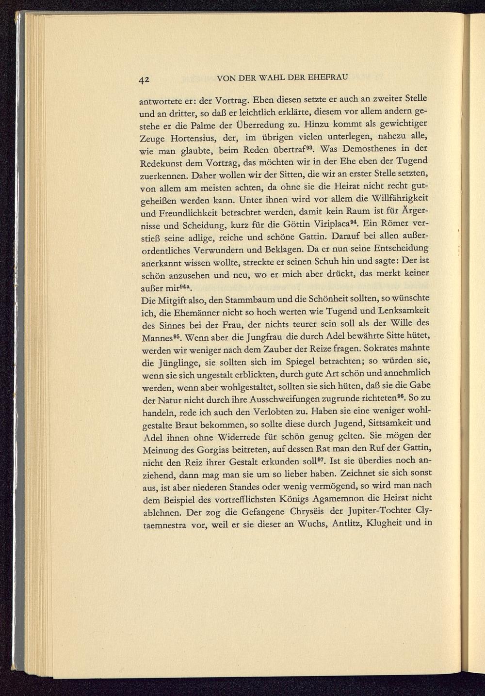 antwortete er: der Vortrag. Eben diesen setzte er auch an zweiter Stelleund an dritter, so daß er leichtlich erklärte, diesem vor allem andern ge-stehe er die Palme der Überredung zu. Hinzu kommt als gewichtigerZeuge Hortensius , der, im übrigen vielen unterlegen, nahezu alle,wie man glaubte, beim Reden übertraf 93 . Was Demosthenes in derRedekunst dem Vortrag, das möchten wir in der Ehe eben der Tugendzuerkennen. Daher wollen wir der Sitten, die wir an erster Stelle setzten,von allem am meisten achten, da ohne sie die Heirat nicht recht gut-geheißen werden kann. Unter ihnen wird vor allem die Willfährigkeitund Freundlichkeit betrachtet werden, damit kein Raum ist für Ärger-nisse und Scheidung, kurz für die Göttin Viriplaca 94 . Ein Römer ver-stieß seine adlige, reiche und schöne Gattin. Darauf bei allen außer-ordentliches Verwundern und Beklagen. Da er nun seine Entscheidunganerkannt wissen wollte, streckte er seinen Schuh hin und sagte: Der istschön anzusehen und neu, wo er mich aber drückt, das merkt keineraußer mir 94a .