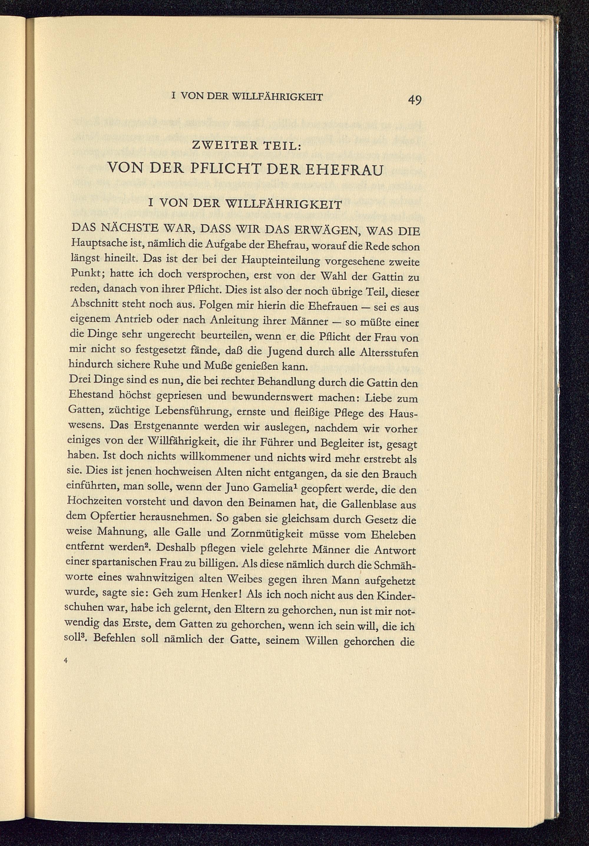 Drei Dinge sind es nun, die bei rechter Behandlung durch die Gattin denEhestand höchst gepriesen und bewundernswert machen: Liebe zumGatten, züchtige Lebensführung, ernste und fleißige Pflege des Haus-wesens. Das Erstgenannte werden wir auslegen, nachdem wir vorhereiniges von der Willfährigkeit, die ihr Führer und Begleiter ist, gesagthaben. Ist doch nichts willkommener und nichts wird mehr erstrebt alssie. Dies ist jenen hochweisen Alten nicht entgangen, da sie den Braucheinführten, man solle, wenn der Juno Gamelia 1 geopfert werde, die denHochzeiten vorsteht und davon den Beinamen hat, die Gallenblase ausdem Opfertier herausnehmen. So gaben sie gleichsam durch Gesetz dieweise Mahnung, alle Galle und Zornmütigkeit müsse vom Ehelebenentfernt werden 2 . Deshalb pflegen viele gelehrte Männer die Antworteiner spartanischen Frau zu billigen. Als diese nämlich durch die Schmäh-worte eines wahnwitzigen alten Weibes gegen ihren Mann aufgehetztwurde, sagte sie: Geh zum Henker! Als ich noch nicht aus den Kinder-schuhen war, habe ich gelernt, den Eltern zu gehorchen, nun ist mir not-wendig das Erste, dem Gatten zu gehorchen, wenn ich sein will, die ichsoll 3 . Befehlen soll nämlich der Gatte, seinem Willen gehorchen die