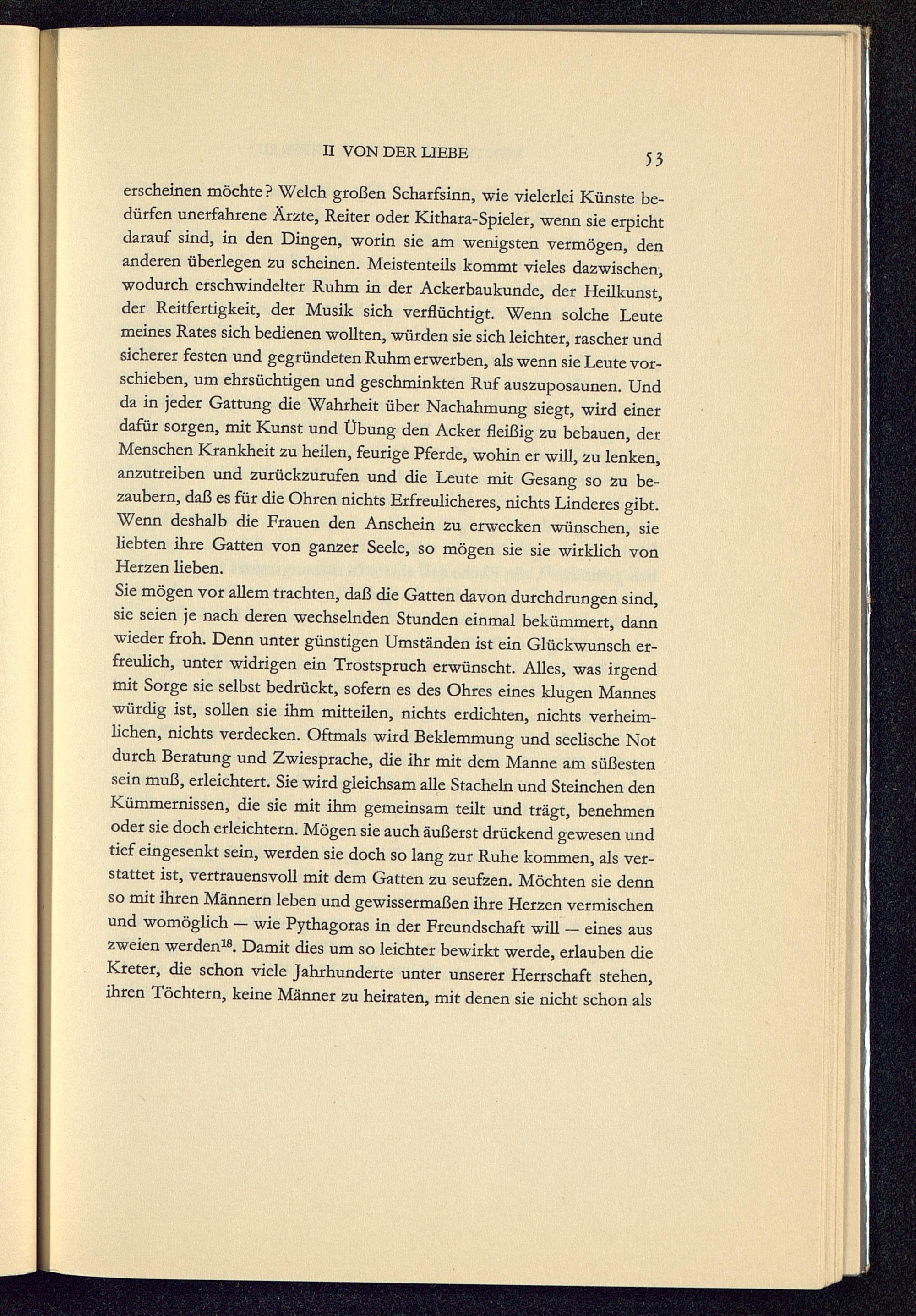 Sie mögen vor allem trachten, daß die Gatten davon durchdrungen sind,sie seien je nach deren wechselnden Stunden einmal bekümmert, dannwieder froh. Denn unter günstigen Umständen ist ein Glückwunsch er-freulich, unter widrigen ein Trostspruch erwünscht. Alles, was irgendmit Sorge sie selbst bedrückt, sofern es des Ohres eines klugen Manneswürdig ist, sollen sie ihm mitteilen, nichts erdichten, nichts verheim-lichen, nichts verdecken. Oftmals wird Beklemmung und seelische Notdurch Beratung und Zwiesprache, die ihr mit dem Manne am süßestensein muß, erleichtert. Sie wird gleichsam alle Stacheln und Steinchen denKümmernissen, die sie mit ihm gemeinsam teilt und trägt, benehmenoder sie doch erleichtern. Mögen sie auch äußerst drückend gewesen undtief eingesenkt sein, werden sie doch so lang zur Ruhe kommen, als ver-stattet ist, vertrauensvoll mit dem Gatten zu seufzen. Möchten sie dennso mit ihren Männern leben und gewissermaßen ihre Herzen vermischenund womöglich — wie Pythagoras in der Freundschaft will — eines auszweien werden 18 . Damit dies um so leichter bewirkt werde, erlauben dieKreter, die schon viele Jahrhunderte unter unserer Herrschaft stehen,ihren Töchtern, keine Männer zu heiraten, mit denen sie nicht schon als