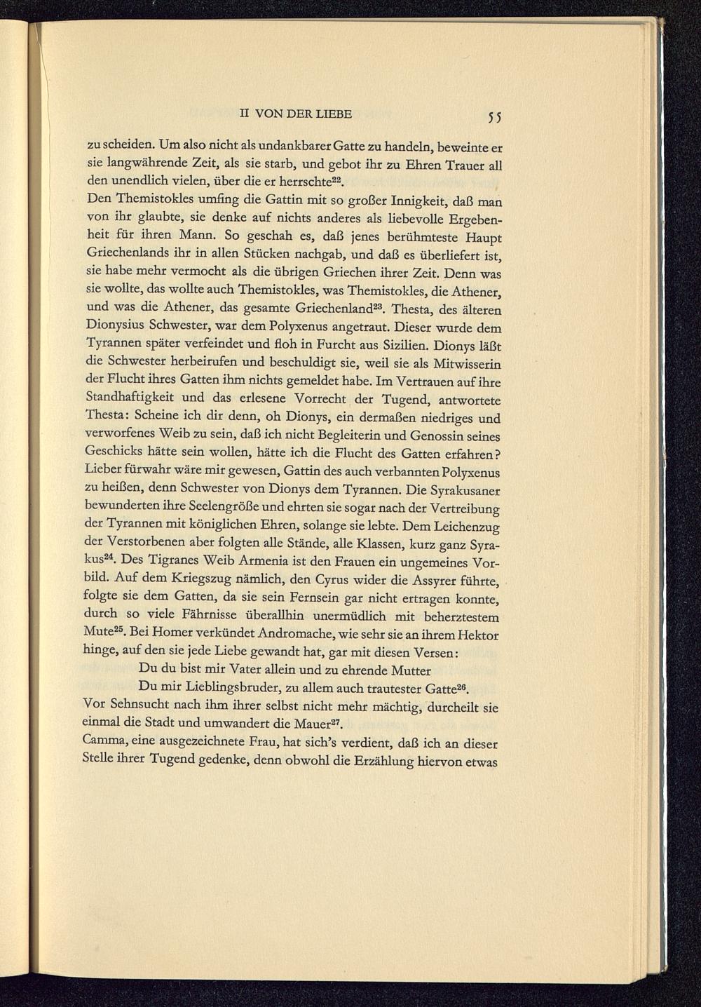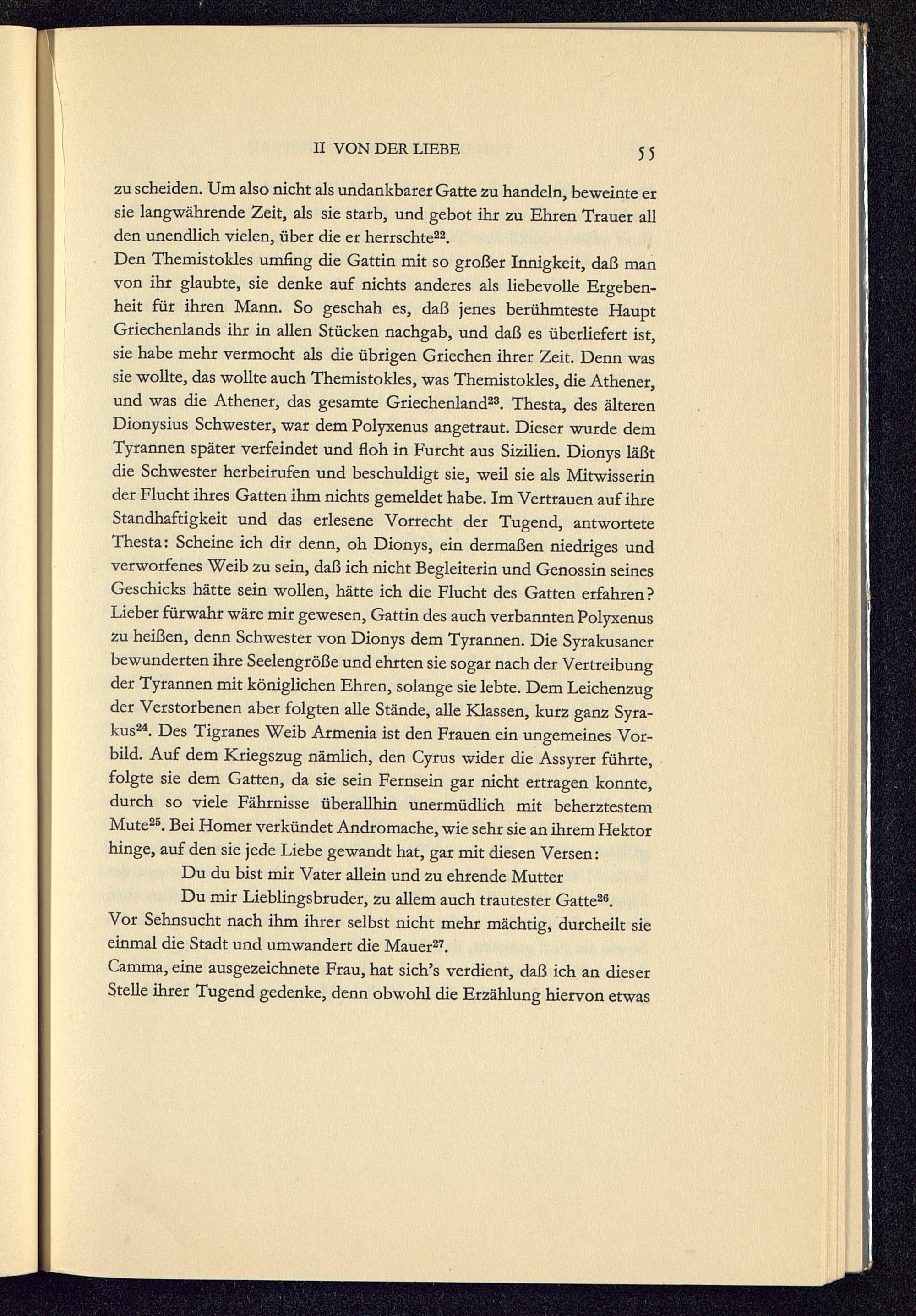 Den Themistokles umfing die Gattin mit so großer Innigkeit, daß manvon ihr glaubte, sie denke auf nichts anderes als liebevolle Ergeben-heit für ihren Mann. So geschah es, daß jenes berühmteste HauptGriechenlands ihr in allen Stücken nachgab, und daß es überliefert ist,sie habe mehr vermocht als die übrigen Griechen ihrer Zeit. Denn wassie wollte, das wollte auch Themistokles, was Themistokles, die Athener ,und was die Athener , das gesamte Griechenland 23 . Thesta, des älterenDionysius Schwester, war dem Polyxenus angetraut. Dieser wurde demTyrannen später verfeindet und floh in Furcht aus Sizilien . Dionys läßtdie Schwester herbeirufen und beschuldigt sie, weil sie als Mitwisserinder Flucht ihres Gatten ihm nichts gemeldet habe. Im Vertrauen auf ihreStandhaftigkeit und das erlesene Vorrecht der Tugend, antworteteThesta: Scheine ich dir denn, oh Dionys, ein dermaßen niedriges undverworfenes Weib zu sein, daß ich nicht Begleiterin und Genossin seinesGeschicks hätte sein wollen, hätte ich die Flucht des Gatten erfahren?Lieber fürwahr wäre mir gewesen, Gattin des auch verbannten Polyxenuszu heißen, denn Schwester von Dionys dem Tyrannen. Die Syrakusanerbewunderten ihre Seelengröße und ehrten sie sogar nach der Vertreibungder Tyrannen mit königlichen Ehren, solange sie lebte. Dem Leichenzugder Verstorbenen aber folgten alle Stände, alle Klassen, kurz ganz Syra-kus 24 . Des Tigranes Weib Armenia ist den Frauen ein ungemeines Vor-bild. Auf dem Kriegszug nämlich, den Cyrus wider die Assyrer führte,folgte sie dem Gatten, da sie sein Fernsein gar nicht ertragen konnte,durch so viele Fährnisse überallhin unermüdlich mit beherztestemMute 25 . Bei Homer verkündet Andromache , wie sehr sie an ihrem Hektorhinge, auf den sie jede Liebe gewandt hat, gar mit diesen Versen:Du du bist mir Vater allein und zu ehrende MutterDu mir Lieblingsbruder, zu allem auch trautester Gatte 26 .Vor Sehnsucht nach ihm ihrer selbst nicht mehr mächtig, durcheilt sieeinmal die Stadt und umwandert die Mauer 27 .