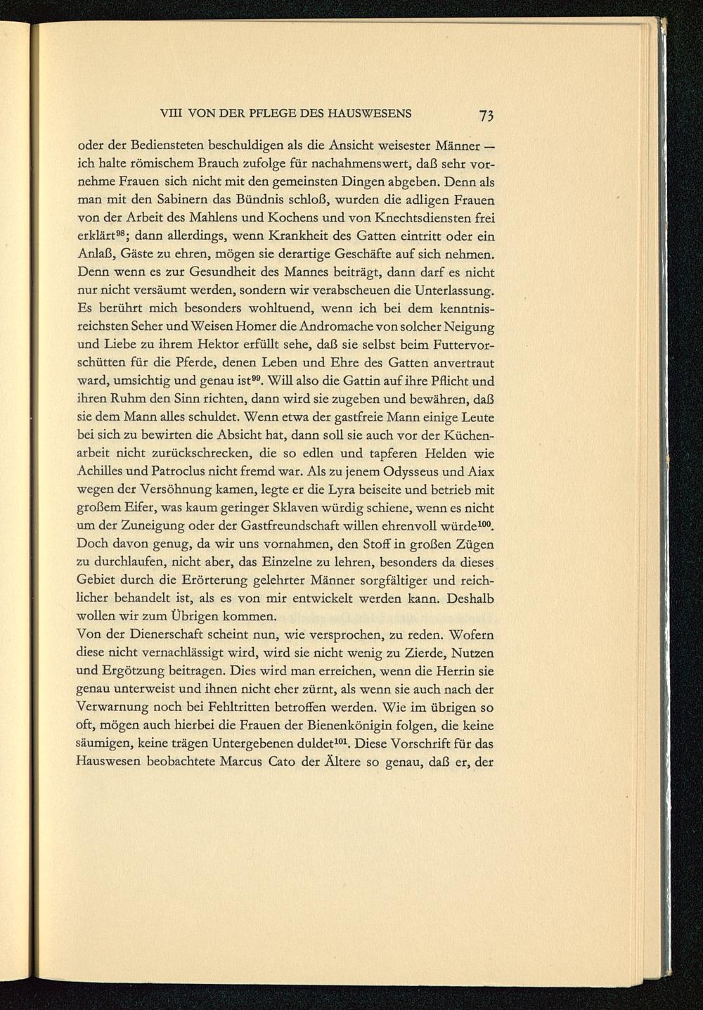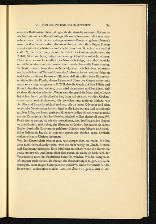 oder der Bediensteten beschuldigen als die Ansicht weisester Männer —ich halte römischem Brauch zufolge für nachahmenswert, daß sehr vor-nehme Frauen sich nicht mit den gemeinsten Dingen abgeben. Denn alsman mit den Sabinern das Bündnis schloß, wurden die adligen Frauenvon der Arbeit des Mahlens und Kochens und von Knechtsdiensten freierklärt 98 ; dann allerdings, wenn Krankheit des Gatten eintritt oder einAnlaß, Gäste zu ehren, mögen sie derartige Geschäfte auf sich nehmen.Denn wenn es zur Gesundheit des Mannes beiträgt, dann darf es nichtnur nicht versäumt werden, sondern wir verabscheuen die Unterlassung.Es berührt mich besonders wohltuend, wenn ich bei dem kenntnis-reichsten Seher und Weisen Homer die Andromache von solcher Neigungund Liebe zu ihrem Hektor erfüllt sehe, daß sie selbst beim Futtervor-schütten für die Pferde, denen Leben und Ehre des Gatten anvertrautward, umsichtig und genau ist". Will also die Gattin auf ihre Pflicht undihren Ruhm den Sinn richten, dann wird sie zugeben und bewähren, daßsie dem Mann alles schuldet. Wenn etwa der gastfreie Mann einige Leutebei sich zu bewirten die Absicht hat, dann soll sie auch vor der Küchen-arbeit nicht zurückschrecken, die so edlen und tapferen Helden wieAchilles und Patroclus nicht fremd war. Als zu jenem Odysseus und Aiax wegen der Versöhnung kamen, legte er die Lyra beiseite und betrieb mitgroßem Eifer, was kaum geringer Sklaven würdig schiene, wenn es nichtum der Zuneigung oder der Gastfreundschaft willen ehrenvoll würde 100 .Doch davon genug, da wir uns vornahmen, den Stoff in großen Zügenzu durchlaufen, nicht aber, das Einzelne zu lehren, besonders da diesesGebiet durch die Erörterung gelehrter Männer sorgfältiger und reich-licher behandelt ist, als es von mir entwickelt werden kann. Deshalbwollen wir zum Übrigen kommen.