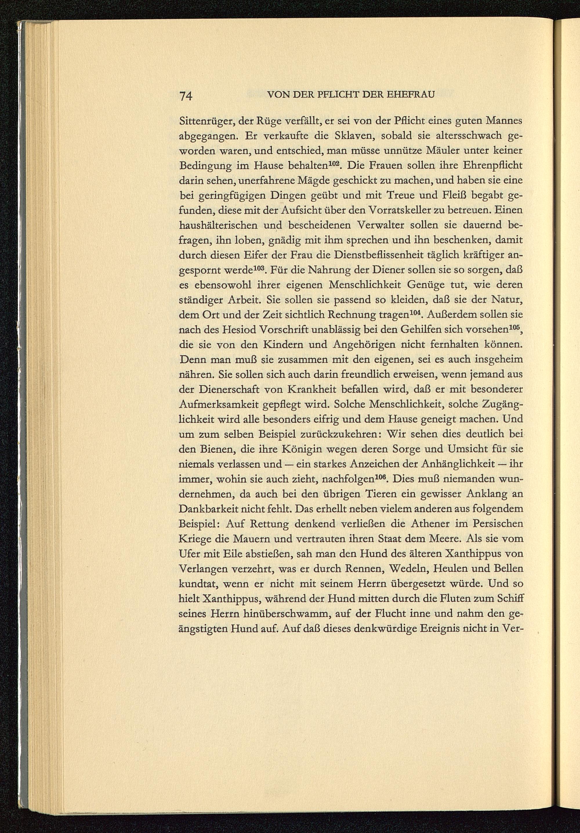 Sittenrüger, der Rüge verfällt, er sei von der Pflicht eines guten Mannesabgegangen. Er verkaufte die Sklaven, sobald sie altersschwach ge-worden waren, und entschied, man müsse unnütze Mäuler unter keinerBedingung im Hause behalten 102 . Die Frauen sollen ihre Ehrenpflichtdarin sehen, unerfahrene Mägde geschickt zu machen, und haben sie einebei geringfügigen Dingen geübt und mit Treue und Fleiß begabt ge-funden, diese mit der Aufsicht über den Vorratskeller zu betreuen. Einenhaushälterischen und bescheidenen Verwalter sollen sie dauernd be-fragen, ihn loben, gnädig mit ihm sprechen und ihn beschenken, damitdurch diesen Eifer der Frau die Dienstbeflissenheit täglich kräftiger an-gespornt werde 103 . Für die Nahrung der Diener sollen sie so sorgen, daßes ebensowohl ihrer eigenen Menschlichkeit Genüge tut, wie derenständiger Arbeit. Sie sollen sie passend so kleiden, daß sie der Natur,dem Ort und der Zeit sichtlich Rechnung tragen 104 . Außerdem sollen sienach des Hesiod Vorschrift unablässig bei den Gehilfen sich vorsehen 105 ,die sie von den Kindern und Angehörigen nicht fernhalten können.Denn man muß sie zusammen mit den eigenen, sei es auch insgeheimnähren. Sie sollen sich auch darin freundlich erweisen, wenn jemand ausder Dienerschaft von Krankheit befallen wird, daß er mit besondererAufmerksamkeit gepflegt wird. Solche Menschlichkeit, solche Zugäng-lichkeit wird alle besonders eifrig und dem Hause geneigt machen. Undum zum selben Beispiel zurückzukehren: Wir sehen dies deutlich beiden Bienen, die ihre Königin wegen deren Sorge und Umsicht für sieniemals verlassen und — ein starkes Anzeichen der Anhänglichkeit — ihrimmer, wohin sie auch zieht, nachfolgen 108 . Dies muß niemanden wun-dernehmen, da auch bei den übrigen Tieren ein gewisser Anklang anDankbarkeit nicht fehlt. Das erhellt neben vielem anderen aus folgendemBeispiel: Auf Rettung denkend verließen die Athener im PersischenKriege die Mauern und vertrauten ihren Staat dem Meere. Als sie vomUfer mit Eile abstießen, sah man den Hund des älteren Xanthippus vonVerlangen verzehrt, was er durch Rennen, Wedeln, Heulen und Bellenkundtat, wenn er nicht mit seinem Herrn übergesetzt würde. Und sohielt Xanthippus, während der Hund mitten durch die Fluten zum Schiffseines Herrn hinüberschwamm, auf der Flucht inne und nahm den ge-ängstigten Hund auf. Auf daß dieses denkwürdige Ereignis nicht in Ver-