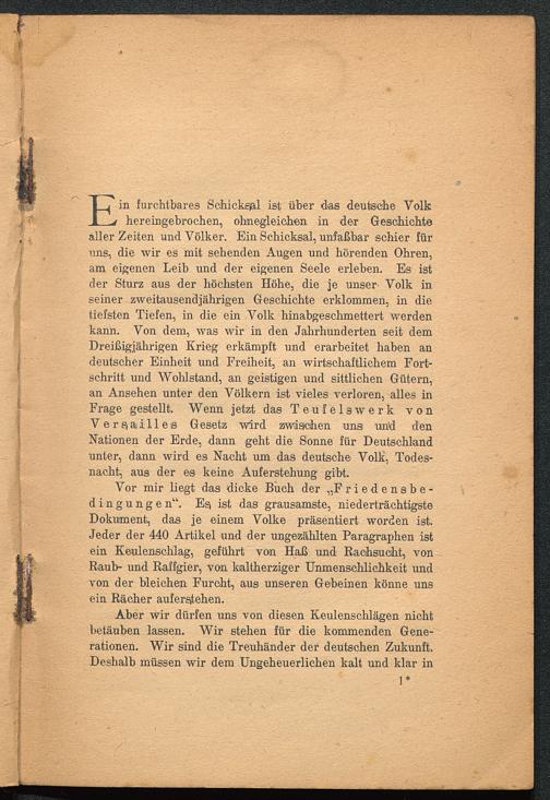 Ein furchtbares Schicksal ist über das deutsche Volkhereingebrochen, ohnegleichen in der Geschichtealler Zeiten und Völker. Ein Schicksal, unfaßbar schier füruns, die wir es mit sehenden Augen und hörenden Ohren,am eigenen Leib und der eigenen Seele erleben. Es istder Sturz aus der höchsten Höhe, die je unser Volk inseiner zweitausendjährigen Geschichte erklommen, in dietiefsten Tiefen, in die ein Volk hinabgeschmettert werdenkann. Von dem, was wir in den Jahrhunderten seit demDreißigjährigen Krieg erkämpft und erarbeitet haben andeutscher Einheit und Freiheit, an wirtschaftlichem Fort-schritt und Wohlstand, an geistigen und sittlichen Gütern,an Ansehen unter den Völkern ist vieles verloren, alles inFrage gestellt. Wenn jetzt das Teufelswerk vonVersailles Gesetz wird zwischen uns und denNationen der Erde, dann geht die Sonne für Deutschland unter, dann wird es Nacht um das deutsche Volk, Todes-nacht, aus der es keine Auferstehung gibt