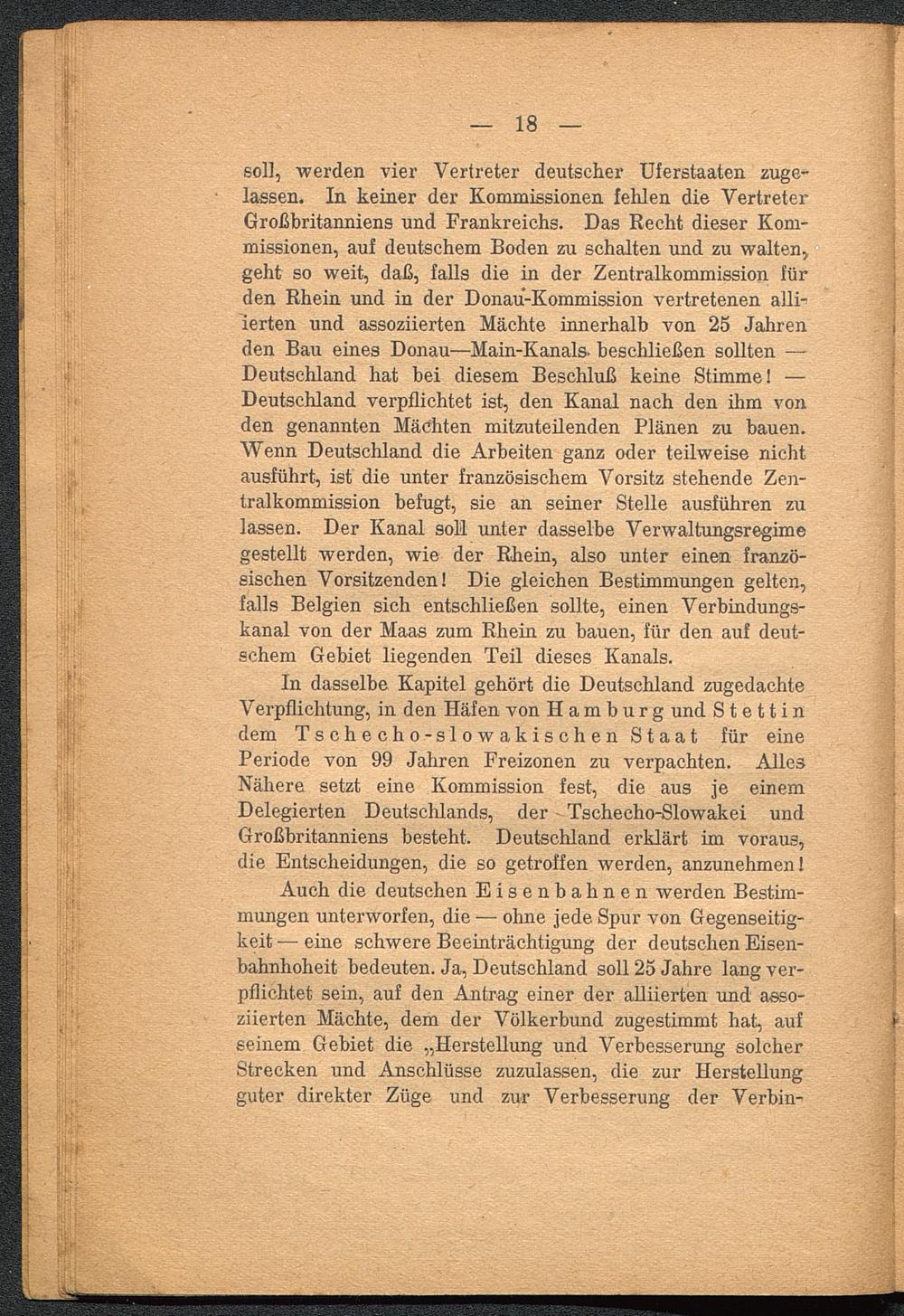 In dasselbe Kapitel gehört die Deutschland zugedachteVerpflichtung, in den Häfen von Hamburg und Stettin dem Tschecho-slowakischen Staat für einePeriode von 99 Jahren Freizonen zu verpachten. AllesNähere setzt eine Kommission fest, die aus je einemDelegierten Deutschlands, der Tschecho-Slowakei undGroßbritanniens besteht. Deutschland erklärt im voraus,die Entscheidungen, die so getroffen werden, anzunehmen!