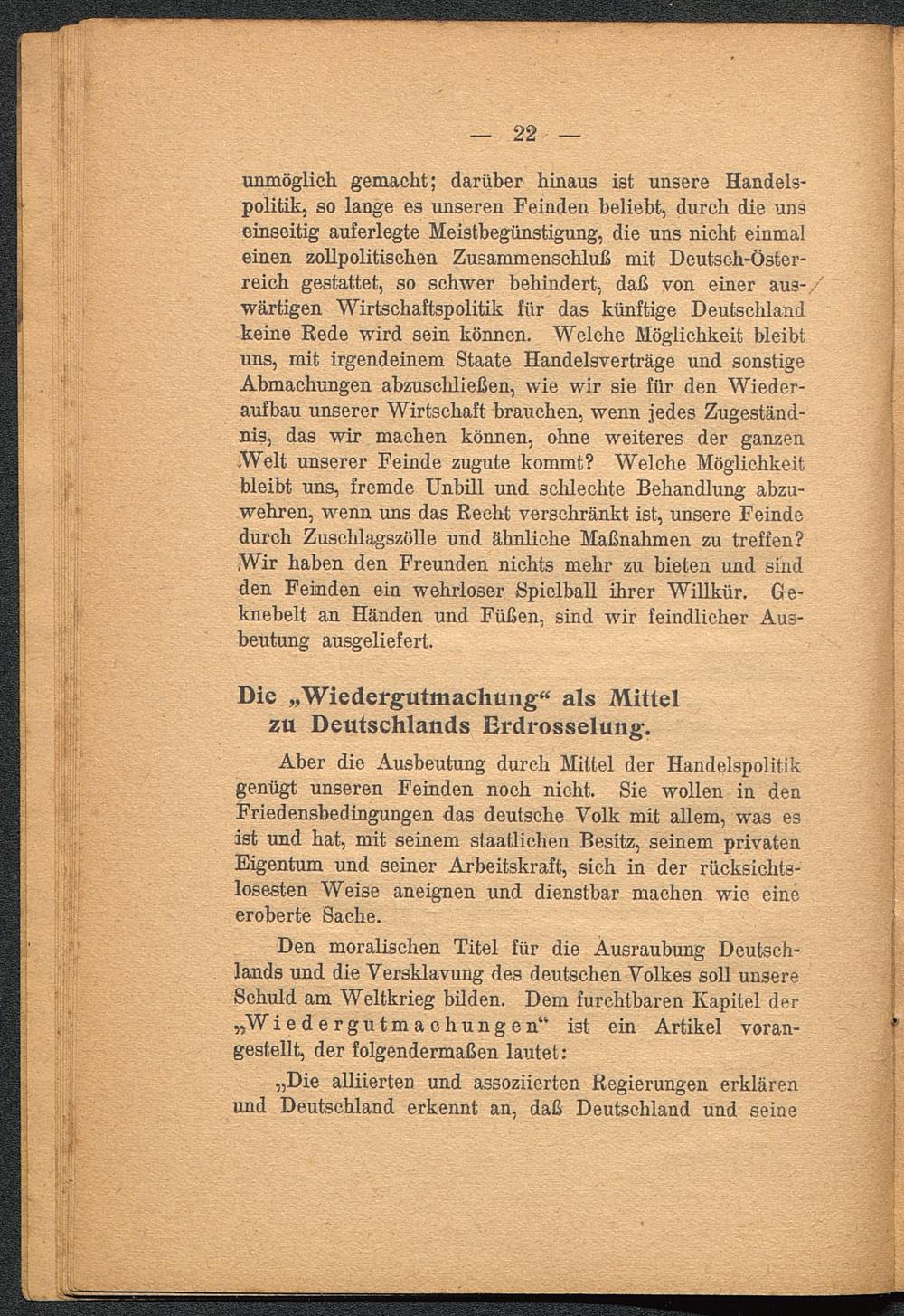 Aber die Ausbeutung durch Mittel der Handelspolitikgenügt unseren Feinden noch nicht. Sie wollen in denFriedensbedingungen das deutsche Volk mit allem, was esist und hat, mit seinem staatlichen Besitz, seinem privatenEigentum und seiner Arbeitskraft, sich in der rücksichts-losesten Weise aneignen und dienstbar machen wie eineeroberte Sache.