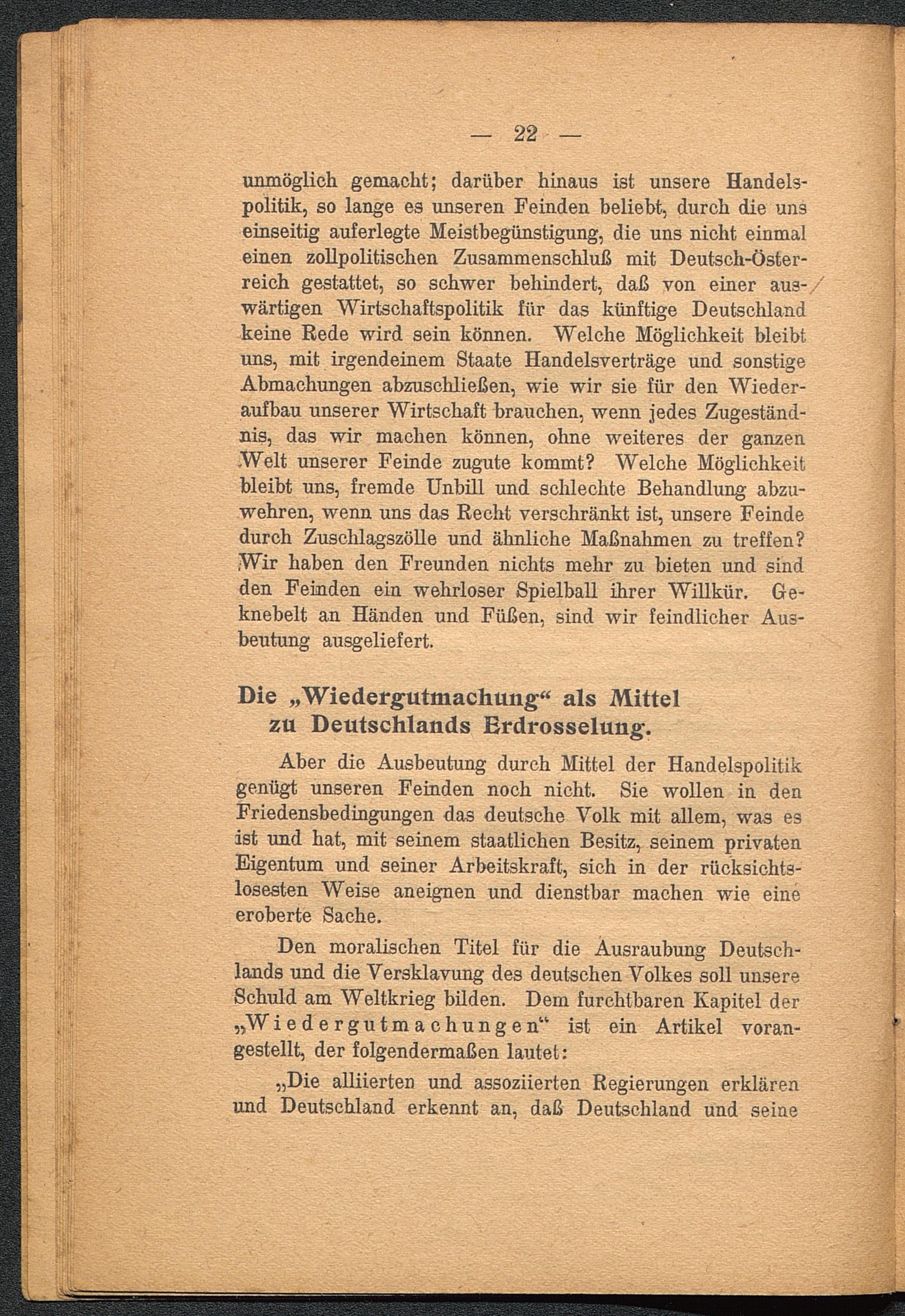 unmöglich gemacht; darüber hinaus ist unsere Handels-politik, so lange es unseren Feinden beliebt, durch die unseinseitig auferlegte Meistbegünstigung, die uns nicht einmaleinen zollpolitischen Zusammenschluß mit Deutsch-Öster-reich gestattet, so schwer behindert, daß von einer aus-wärtigen Wirtschaftspolitik für das künftige Deutschland keine Rede wird sein können. Welche Möglichkeit bleibtuns, mit irgendeinem Staate Handelsverträge und sonstigeAbmachungen abzuschließen, wie wir sie für den Wieder-aufbau unserer Wirtschaft brauchen, wenn jedes Zugeständ-nis, das wir machen können, ohne weiteres der ganzenWelt unserer Feinde zugute kommt? Welche Möglichkeitbleibt uns, fremde Unbill und schlechte Behandlung abzu-wehren, wenn uns das Recht verschränkt ist, unsere Feindedurch Zuschlagszölle und ähnliche Maßnahmen zu treffen?Wir haben den Freunden nichts mehr zu bieten und sindden Feinden ein wehrloser Spielball ihrer Willkür. Ge-knebelt an Händen und Füßen, sind wir feindlicher Aus-beutung ausgeliefert.