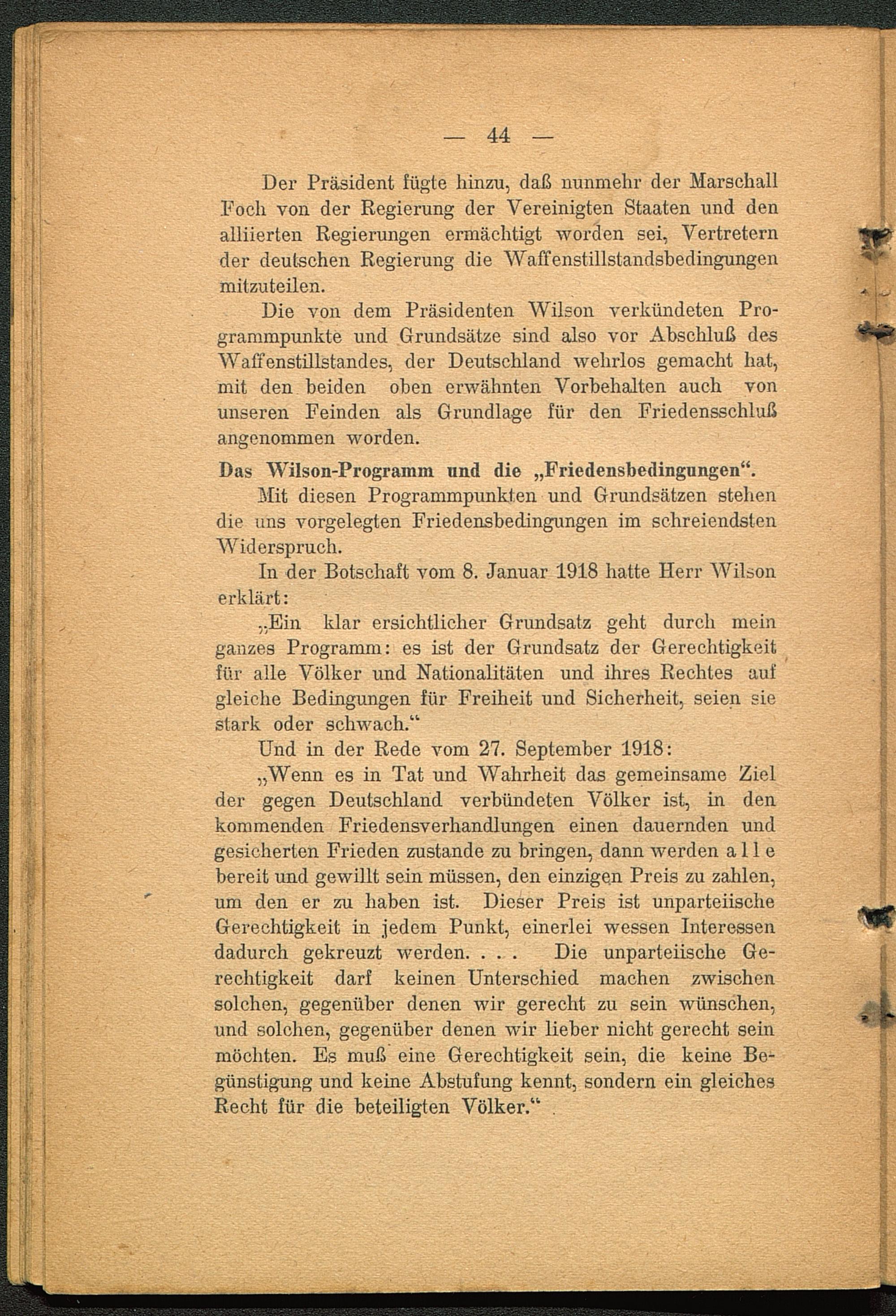 Die von dem Präsidenten Wilson verkündeten Pro-grammpunkte und Grundsätze sind also vor Abschluß desWaffenstillstandes, der Deutschland wehrlos gemacht hat,mit den beiden oben erwähnten Vorbehalten auch vonunseren Feinden als Grundlage für den Friedensschlußangenommen worden.