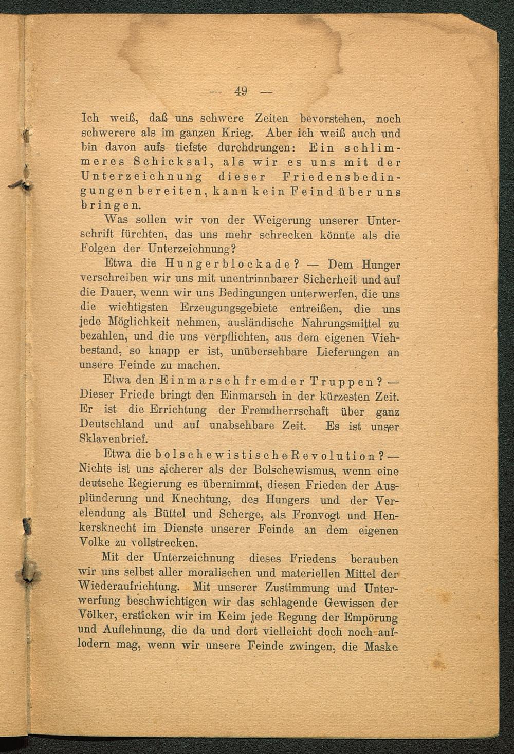 Mit der Unterzeichnung dieses Friedens beraubenwir uns selbst aller moralischen und materiellen Mittel derWiederaufrichtung. Mit unserer Zustimmung und Unter-werfung beschwichtigen wir das schlagende Gewissen derVölker, ersticken wir im Keim jede Regung der Empörungund Auflehnung, die da und dort vielleicht doch noch auf-lodern mag, wenn wir unsere Feinde zwingen, die Maske