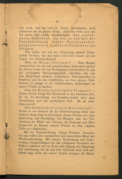 Ich weiß, daß uns schwere Zeiten bevorstehen, nochschwerere als im ganzen Krieg. Aber ich weiß auch undbin davon aufs tiefste durchdrungen: Ein schlim-meres Schicksal, als wir es uns mit derUnterzeichnung dieser F r i e d e n s b e d in -gungen bereiten, kann kein Feind über unsbringen.
