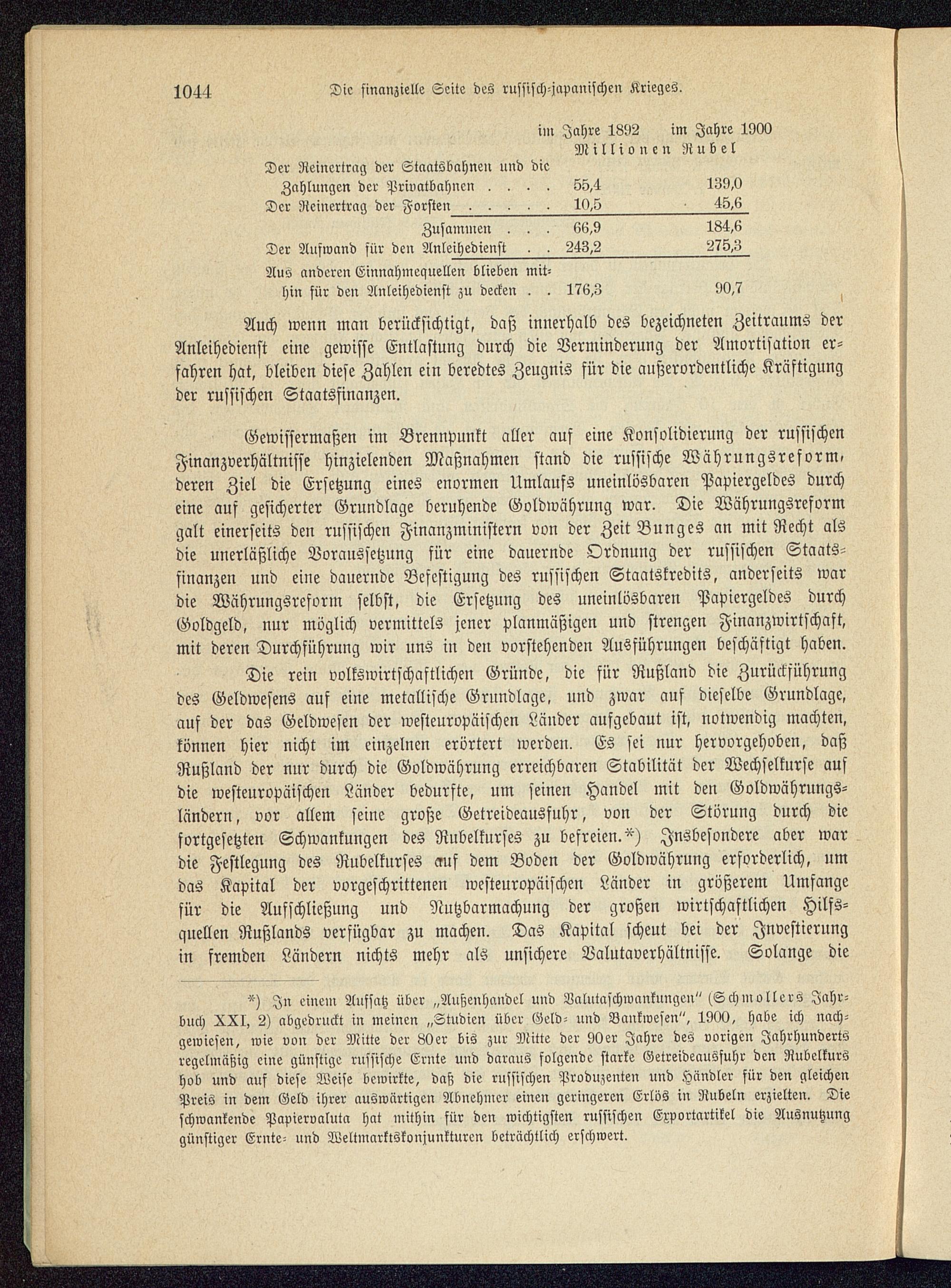 Gewissermaßen im Brennpunkt aller auf eine Konsolidierung der russischen Finanzverhältnisse hinzielenden Maßnahmen stand die russische Währungsreform,deren Ziel die Ersetzung eines enormen Umlaufs uneinlösbaren Papiergeldes durcheine auf gesicherter Grundlage beruhende Goldwährung war. Die Währungsreformgalt einerseits den russischen Finanzministern von der Zeit Bunges an mit Recht alsdie unerläßliche Voraussetzung für eine dauernde Ordnung der russischen Staats-finanzen und eine dauernde Befestigung des russischen Staatskredits, anderseits wardie Währungsreform selbst, die Ersetzung des uneinlösbaren Papiergeldes durchGoldgeld, nur möglich vermittels jener planmäßigen und strengen Finanzwirtschaft,mit deren Durchführung wir uns in den vorstehenden Ausführungen beschäftigt haben.