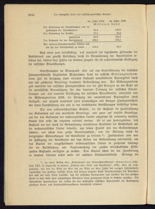 In einem Aussatz über „Außenhandel und Bnlutaschwankuugeu" <Sch mollers Jahr-buch XXI, 2) abgedruckt in meinen „Studien über Geld- und Bankwesen", 1900, habe ich nach-gewiesen, wie von der Mitte der 80er bis zur Mitte der 90er Jahre des vorigen Jahrhundertsregelmäßig eine günstige russische Ernte und daraus folgende starke Getreideausfuhr den Nubelkurshob und auf diese Weise bewirkte, daß die russischen Produzenten und Händler für den gleichenPreis in dem Geld ihrer auswärtigen Abnehmer einen geringeren Erlös in Rubeln erzielten. Dieschwankende Papiervaluta hat mithin für den wichtigsten russischen Exportartikel die Ausnutzunggünstiger Ernte- und Weltmarklskonjunkturcn beträchtlich erschwert.