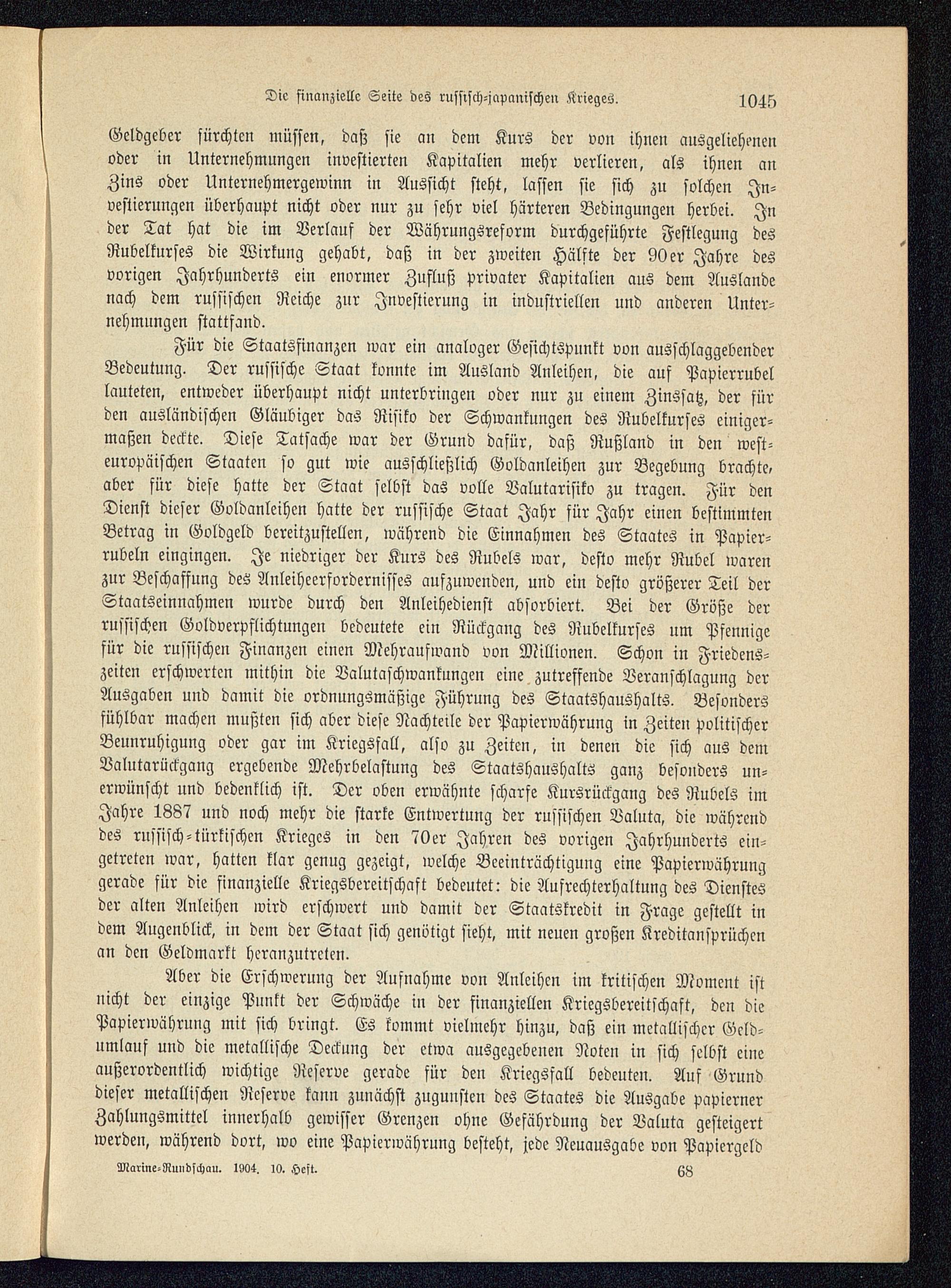 Aber die Erschwerung der Aufnahme von Anleihen im kritischen Moment istnicht der einzige Punkt der Schwäche in der finanziellen Kriegsbereitschaft, den diePapierwährung mit sich bringt. Es kommt vielmehr hinzu, daß ein metallischer Geld-umlauf und die metallische Dectuug der etwa ausgegebenen Noten in sich selbst eineaußerordentlich wichtige Reserve gerade für den Kriegsfall bedeuten. Auf Grunddieser metallischen Reserve kann zunächst zugunsten des Staates die Ausgabe papiernerZahlungsmittel innerhalb gewisser Grenzen ohne Gefährdung der Valuta gesteigertwerden, während dort, wo eine Papierwährung besteht, jede Neuausgabe von Papiergeld