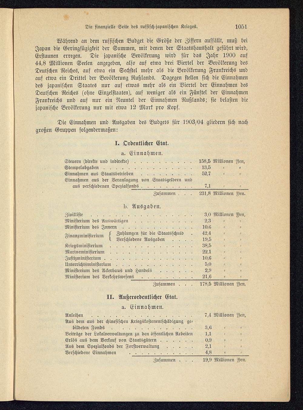Während an dem russischen Budget die Größe der Ziffern auffällt, muß beiJapan die Geringfügigkeit der Summen, mit denen der Staatshaushalt geführt wird,Erstaunen erregen. Die japanische Bevölkerung wird für das Jahr 1900 auf44,8 Millionen Seelen angegeben, also auf etwa drei Viertel der Bevölkerung desDeutschen Reiches, auf etwa ein Sechstel mehr als die Bevölkerung Frankreichs undauf etwa ein Drittel der Bevölkerung Rußlands . Dagegen stellen sich die Einnahmendes japanischen Staates nur auf etwas mehr als ein Viertel der Einnahmen desDeutschen Reiches (ohne Einzelstaaten), auf weniger als ein Fünftel der EinnahmenFrankreichs und auf nur ein Neuntel der Einnahmen Nußlands; sie belasten diejapanische Bevölkerung nur mit etwa l2 Mark pro Kopf.