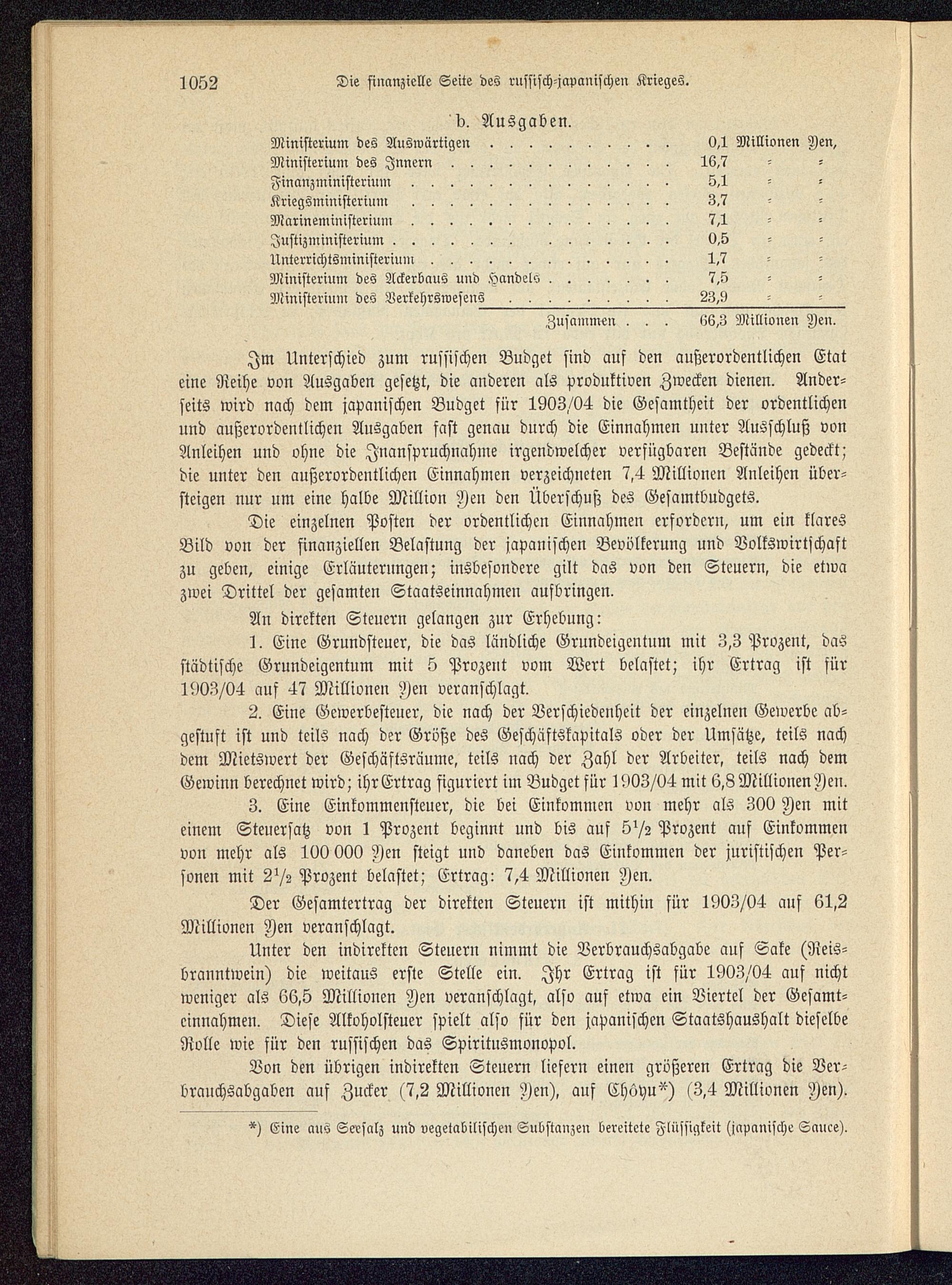 Unter den indirekten Steuern nimmt die Verbrauchsabgabe auf Sake (Reis-branntwein) die weitaus erste Stelle ein. Ihr Ertrag ist für 1903/04 auf nichtweniger als 66,5 Millionen Jen veranschlagt, also auf etwa ein Viertel der Gesamt-einnahmen. Diese Alkoholsteuer spielt also für den japanischen Staatshaushalt dieselbeRolle wie für den russischen das Spiritnsmonopol.