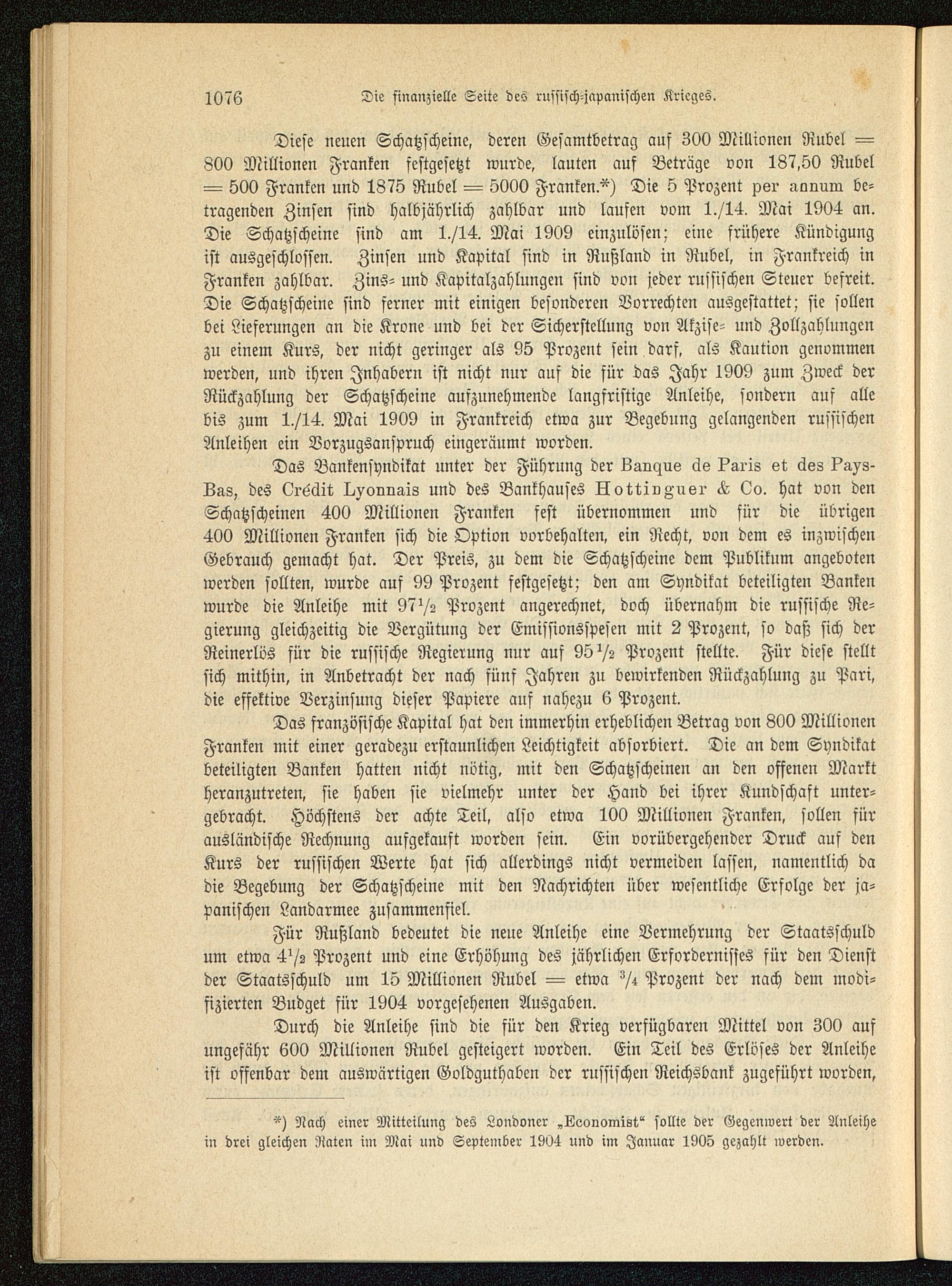 Durch die Anleihe sind die für den Krieg verfügbaren Mittel von 300 aufungefähr 600 Millionen Rubel gesteigert worden. Ein Teil des Erlöses der Anleiheist offenbar dem auswärtigen Goldguthaben der russischen Reichsbank zugeführt worden,