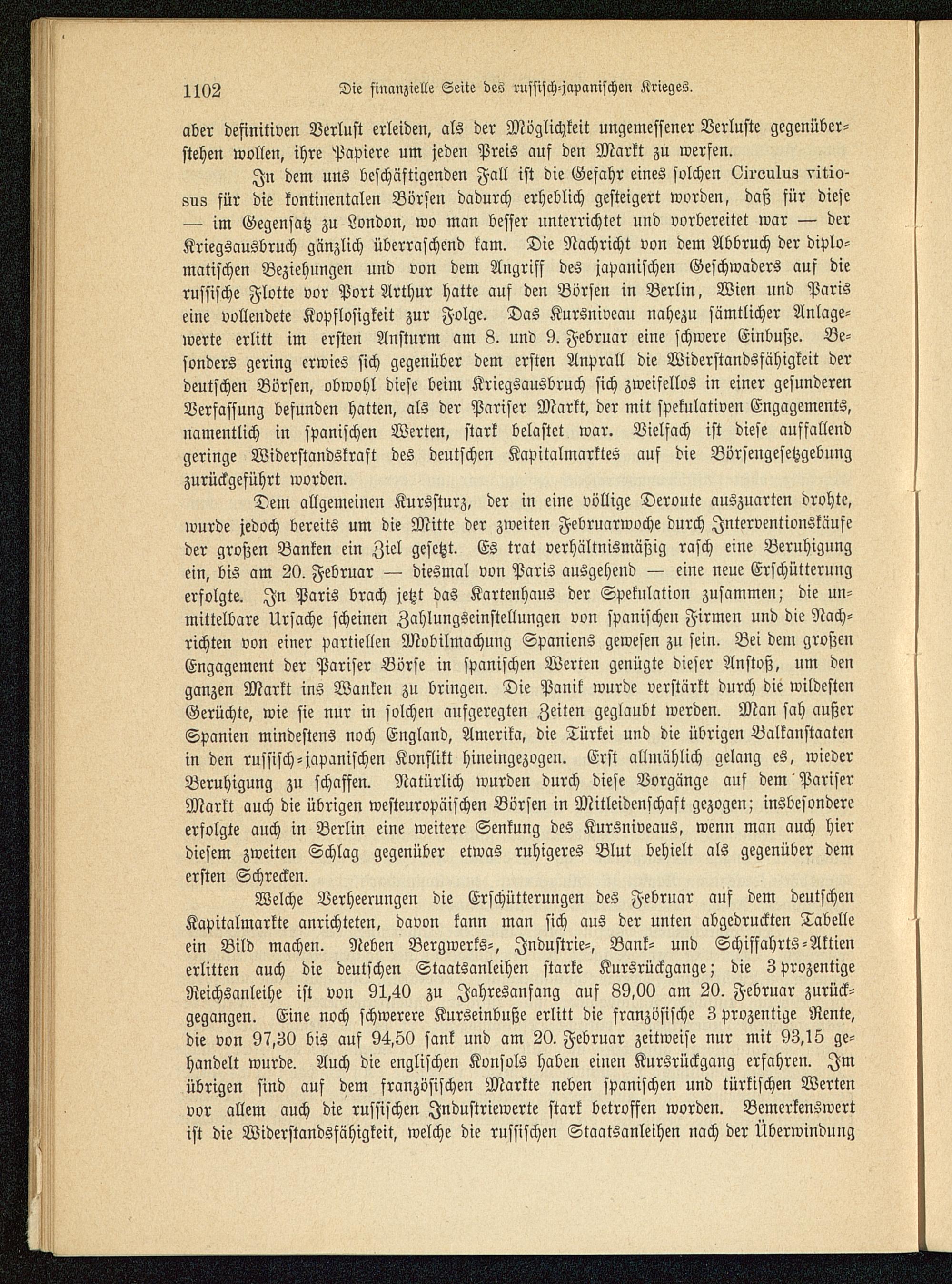 In dem uns beschäftigenden Fall ist die Gefahr eines solchen (üireulus vitio-sus für die kontinentalen Börsen dadurch erheblich gesteigert worden, daß für diese— im Gegensatz zu London , wo man besser unterrichtet und vorbereitet war — derKriegsausbruch gänzlich überraschend kam. Die Nachricht von dem Abbruch der diplo-matischen Beziehungen und von dem Angriff des japanischen Geschwaders auf dierussische Flotte vor Port Arthur hatte auf den Börsen in Berlin, Wien und Paris eine vollendete Kopflosigkeit zur Folge. Das Kursniveau nahezu sämtlicher Anlage-werte erlitt im ersten Ansturm am 8. und 9. Februar eine schwere Einbuße. Be-sonders gering erwies sich gegenüber dem ersten Anprall die Widerstandsfähigkeit derdeutschen Börsen, obwohl diese beim Kriegsausbruch sich zweifellos in einer gesunderenVerfassung befunden hatten, als der Pariser Markt, der mit spekulativen Engagements,namentlich in spanischen Werten, stark belastet war. Vielfach ist diese auffallendgeringe Widerstandskraft des deutschen Kapitalmarktes auf die Börsengesetzgebungzurückgeführt worden.