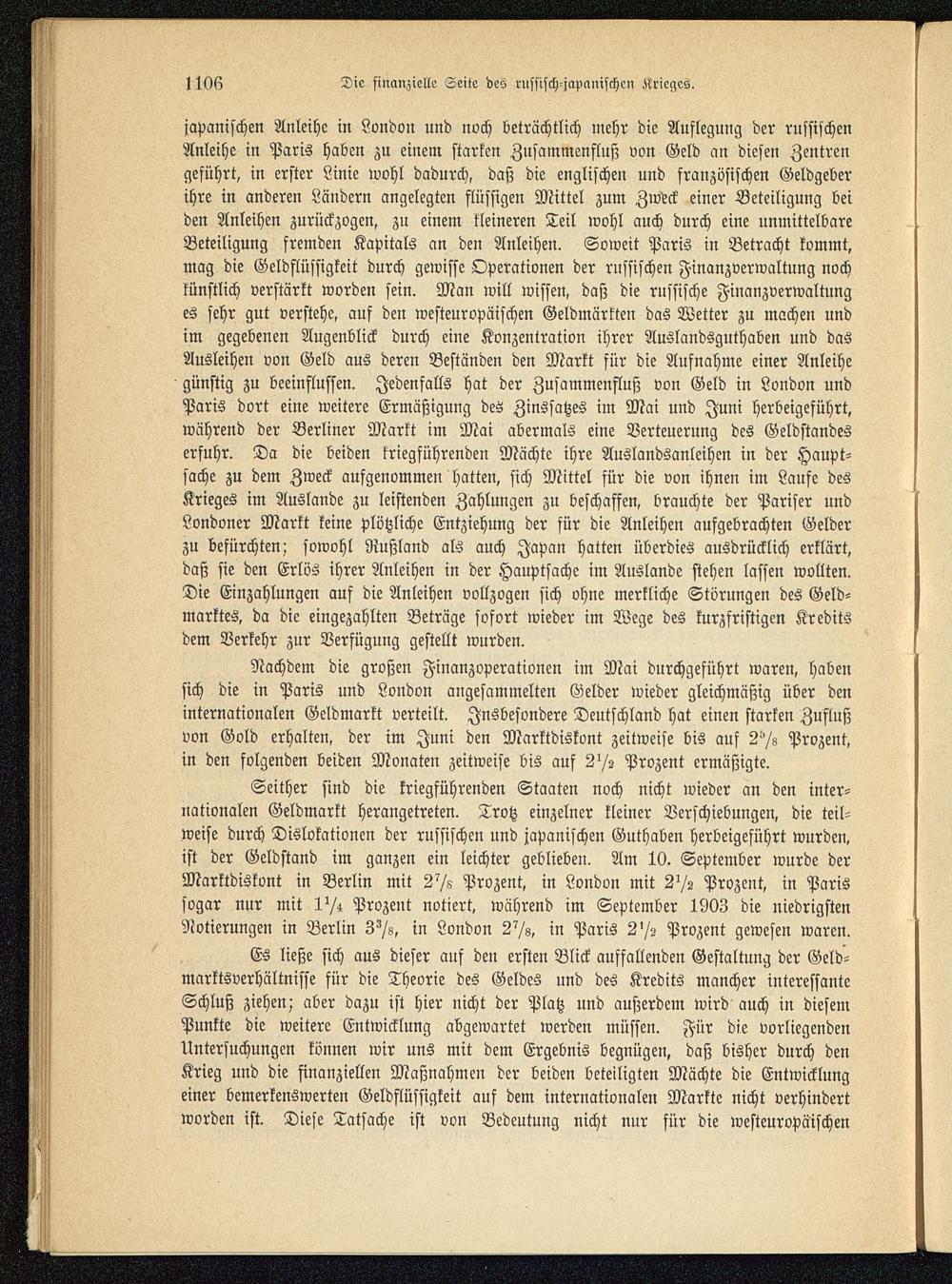 Nachdem die großen Finanzoperationen im Mai durchgeführt waren, habensich die in Paris und London augesammelten Gelder wieder gleichmäßig über deninternationalen Geldmarkt verteilt. Insbesondere Deutschland hat einen starken Zuflußvon Gold erhalten, der im Juni den Marktdiskont zeitweise bis auf 2^8 Prozent,in den folgenden beiden Monaten zeitweise bis auf 2^2 Prozent ermäßigte.