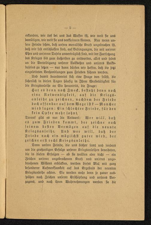 Hat es denn noch Zweck, besteht denn nocheine Notwendigkeit, auf die Kriegs-anleihe zu zeichnen, nachdem der FriededochoffenbaraufdemWegei st? — Mancherwirdsagen:EinschlechterFriede,fürden »kein Opfer mehr lohnt.Darauf gibt es nur die Antwort: Wer will, daßes zum Frieden kommt, der zeichne nachseinem besten Vermögen auf die neunteKriegsanleihe. Und wer will, daß derFriede noch ein möglichst guter wird, derzeichne erst recht Kriegsanleihe.