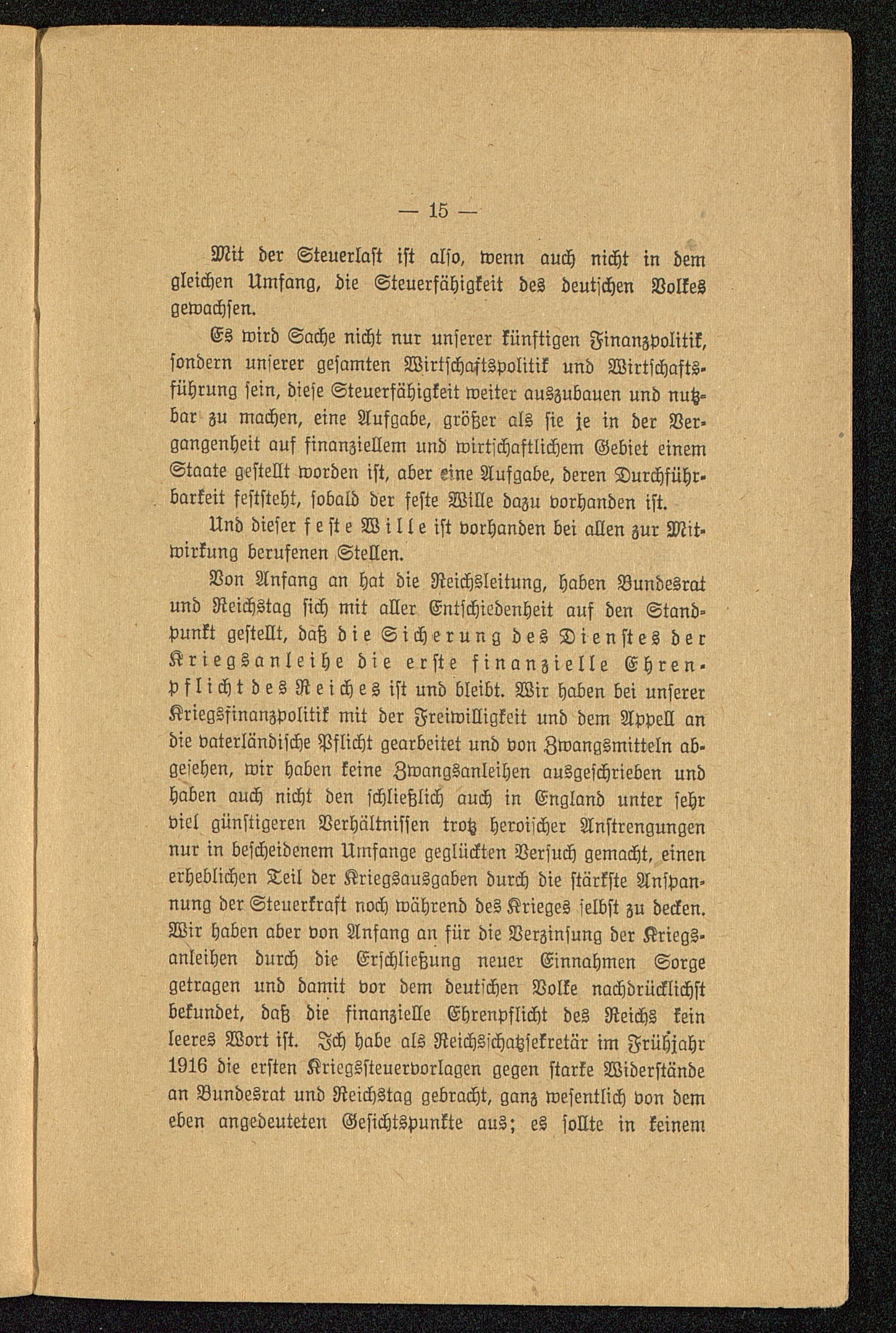 Von Anfang an hat die Reichsleitung, haben Bundesratund Reichstag sich mit aller Entschiedenheit auf den Stand-punkt gestellt, daß die Sicherung des Dienstes derKriegsanleihe die erste finanzielle Ehren-pflicht des Reiches ist und bleibt. Wir haben bei unsererKriegsfinanzpolitik mit der Freiwilligkeit und dem Appell andie vaterländische Pflicht gearbeitet und von Zwangsmitteln ab-gesehen, wir haben keine Zwangsanleihen ausgeschrieben undhaben auch nicht den schließlich auch in England unter sehrviel günstigeren Verhältnissen trotz heroischer Anstrengungennur in bescheidenem Uinfange geglückten Versuch gemacht, einenerheblichen Teil der Kriegsausgaben durch die stärkste Anspan-nung der Steuerkraft noch während des Krieges selbst zu decken.Wir haben aber von Anfang an für die Verzinsung der Kriegs-anleihen durch die Erschließung neuer Einnahmen Sorgegetragen und damit vor dem deutschen Volke nachdrücklichstbekundet, daß die finanzielle Ehrenpflicht des Reichs keinleeres Wort ist. Ich habe als Reichsschatzsekretär im Frühjahr1916 die ersten Kriegssteuervorlagen gegen starke Widerständean Bundesrat und Reichstag gebracht, ganz wesentlich von demeben angedeuteten Gesichtspunkte aus; es sollte in keinem