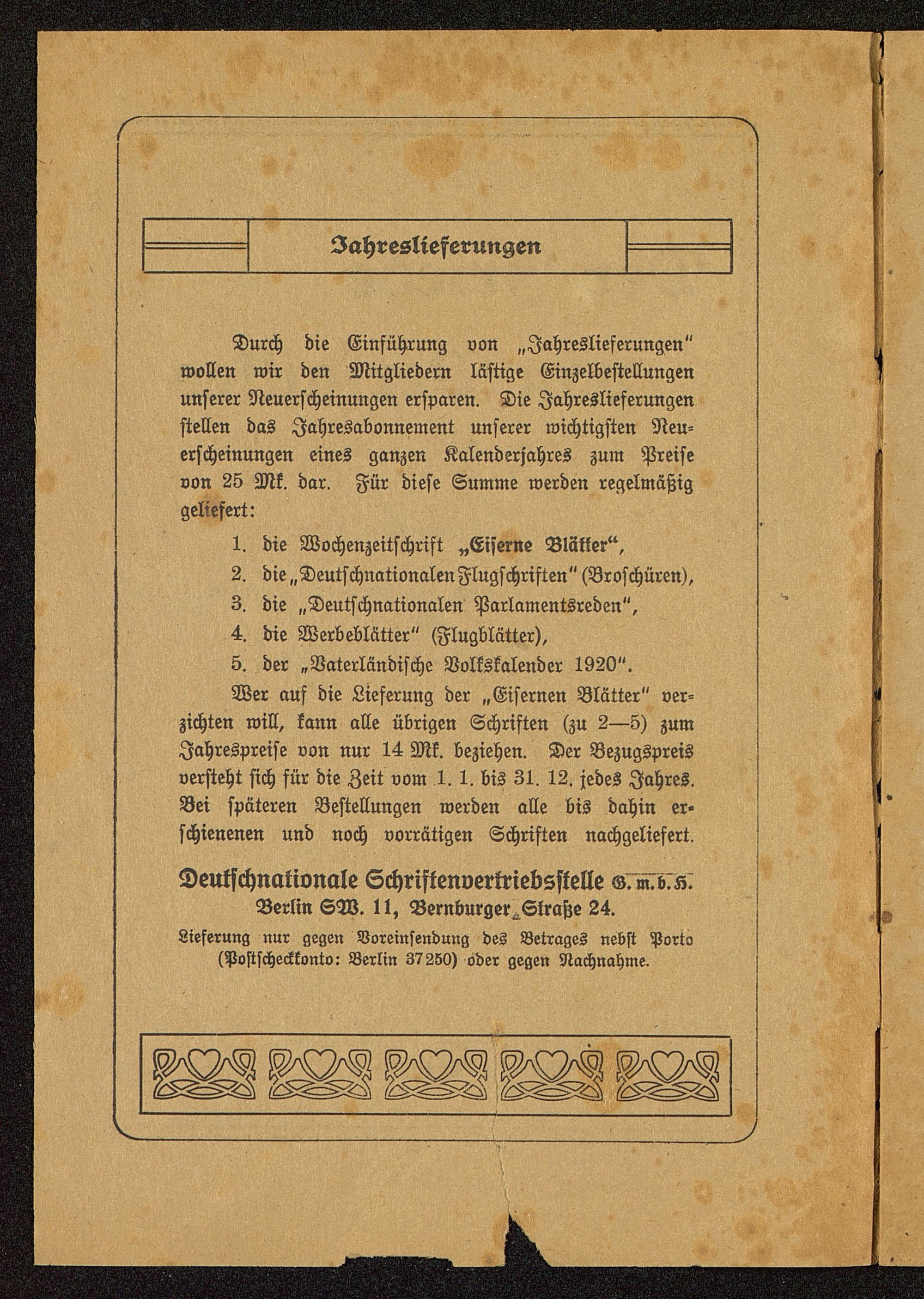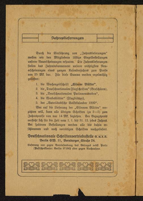 Wer auf die Lieferung der „Eisernen Blätter" ver-zichten will, kann alle übrigen Schriften (zu 2—5) zumJahrespreise von nur 14 Mk. beziehen. Der Bezugspreisversteht sich für die Zeit vom 1.1. bis 31. 12. jedes Jahres.Bei späteren Bestellungen werden alle bis dahin er-schienenen und noch vorrätigen Schriften nachgeliefert.