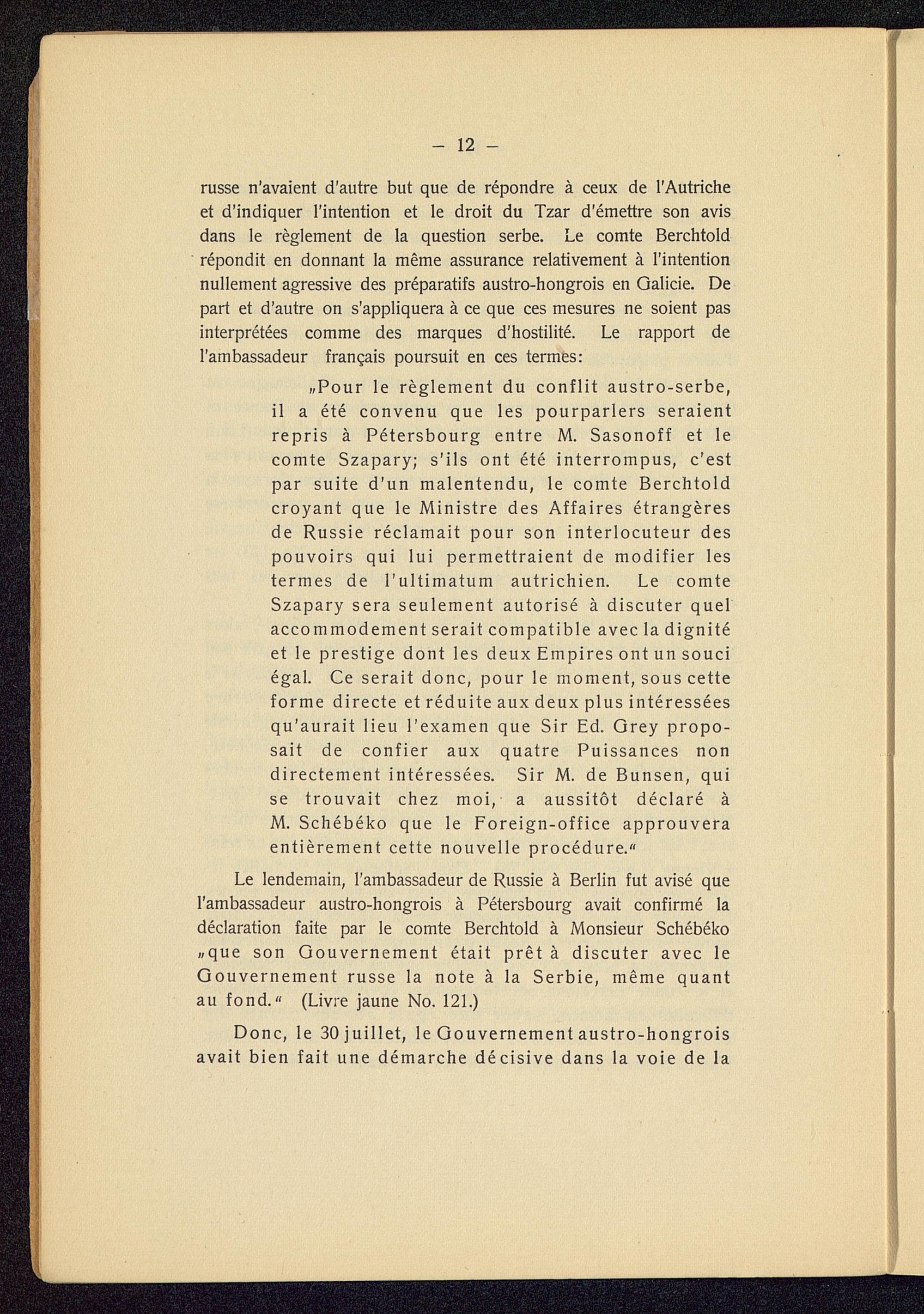 Le lendemain, l'ambassadeur de Russie à Berlin fut avisé quel'ambassadeur austro-hongrois à Pétersbourg avait confirmé ladéclaration faite par le comte Berchtold à Monsieur Schébéko«que son Gouvernement était prêt à discuter avec leGouvernement russe la note à la Serbie , même quantau fond." (Livre jaune No. 121.)