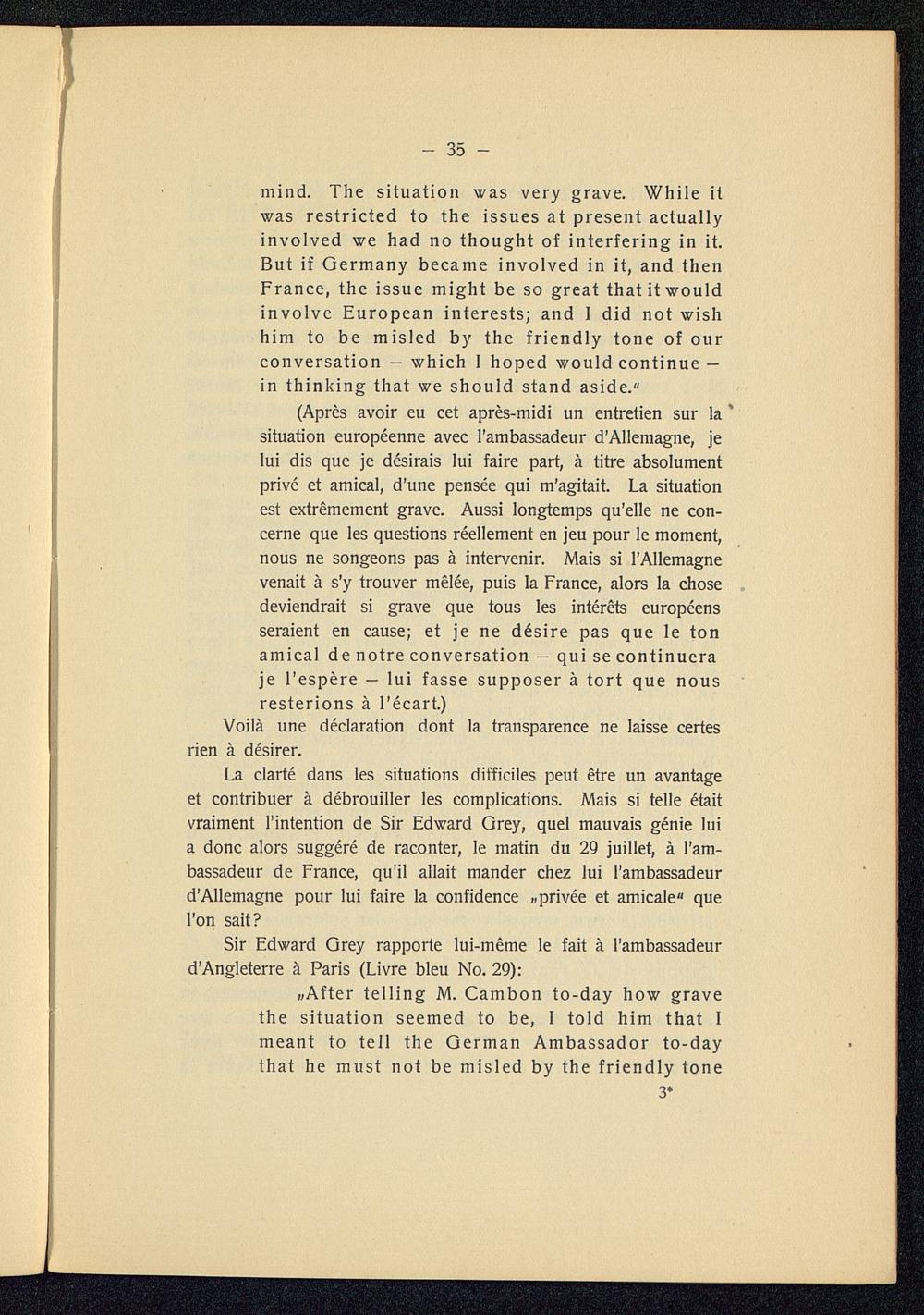 Sir Edward Grey rapporte lui-même le fait à l'ambassadeurd'Angleterre à Paris (Livre bleu No. 29):