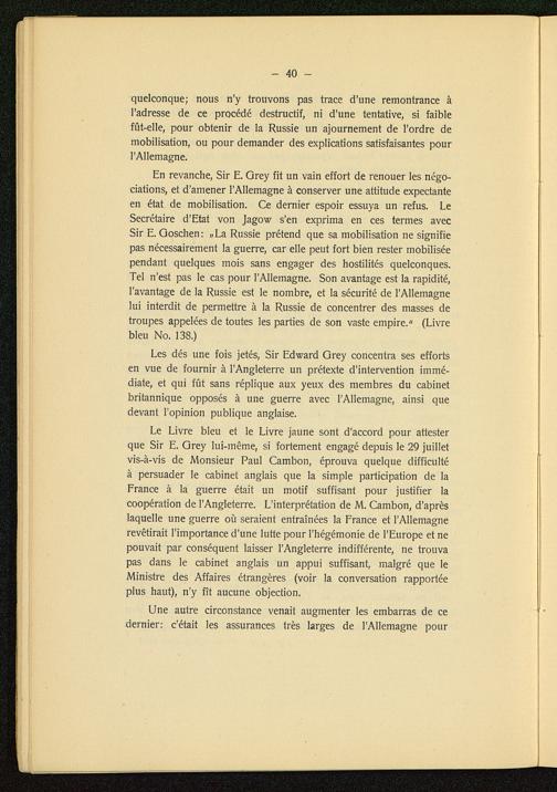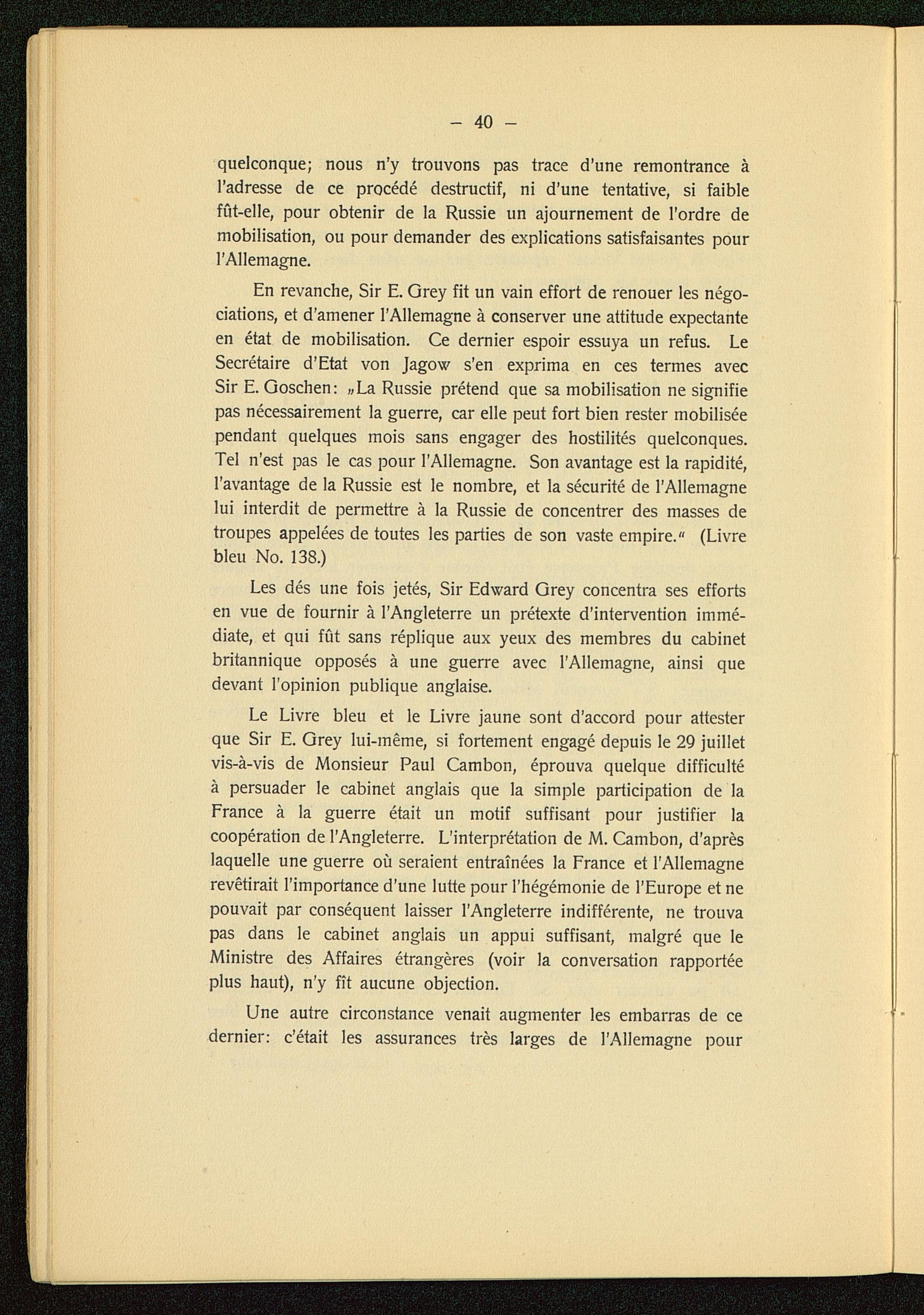 Le Livre bleu et le Livre jaune sont d'accord pour attesterque Sir E. Grey lui-même , si fortement engagé depuis le 29 juilletvis-à-vis de Monsieur Paul Cambon , éprouva quelque difficultéà persuader le cabinet anglais que la simple participation de laFrance à la guerre était un motif suffisant pour justifier lacoopération de l'Angleterre . L'interprétation de M. Cambon, d'aprèslaquelle une guerre où seraient entraînées la France et l'Allemagne revêtirait l'importance d'une lutte pour l'hégémonie de l'Europe et nepouvait par conséquent laisser l'Angleterre indifférente, ne trouvapas dans le cabinet anglais un appui suffisant, malgré que leMinistre des Affaires étrangères (voir la conversation rapportéeplus haut), n'y fît aucune objection.
