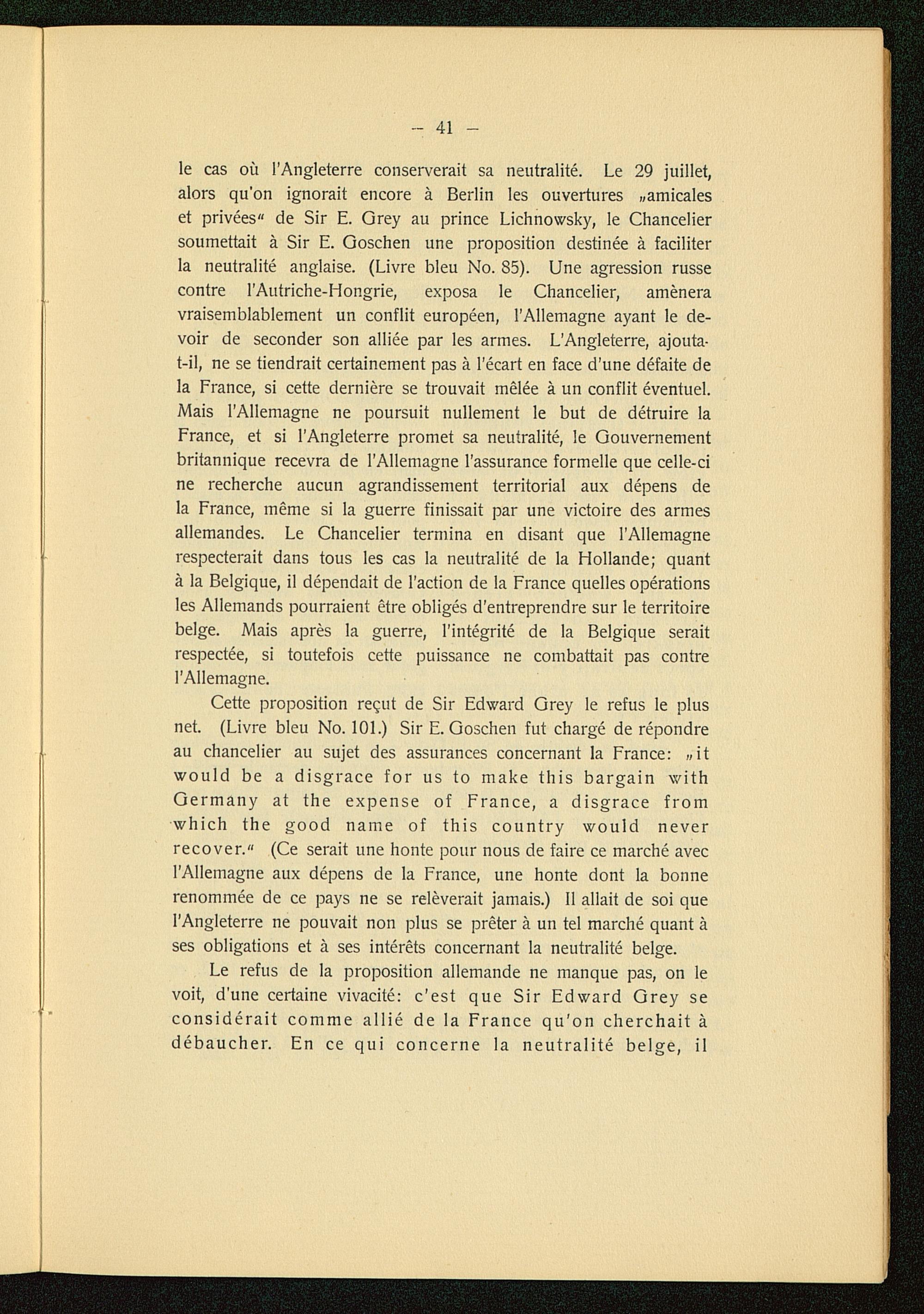 Cette proposition reçut de Sir Edward Grey le refus le plusnet. (Livre bleu No. 101.) Sir E. Goschen fut chargé de répondreau chancelier au sujet des assurances concernant la France : vitwould be a disgrace for us to make this bargain withGermany at the expense of France , a disgrace fromwhich the good name of this country would neverrecover." (Ce serait une honte pour nous de faire ce marché avecl'Allemagne aux dépens de la France , une honte dont la bonnerenommée de ce pays ne se relèverait jamais.) Il allait de soi quel'Angleterre ne pouvait non plus se prêter à un tel marché quant àses obligations et à ses intérêts concernant la neutralité belge .