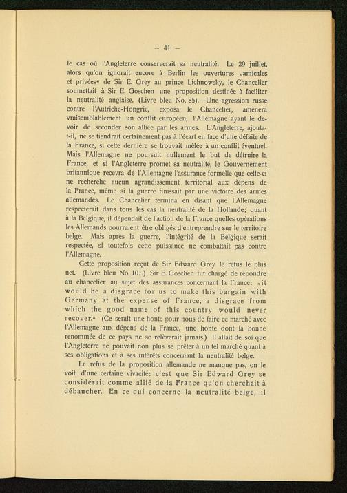 Le refus de la proposition allemande ne manque pas, on levoit, d'une certaine vivacité: c'est que Sir Edward Grey seconsidérait comme allié de la France qu'on cherchait àdébaucher. En ce qui concerne la neutralité belge , il