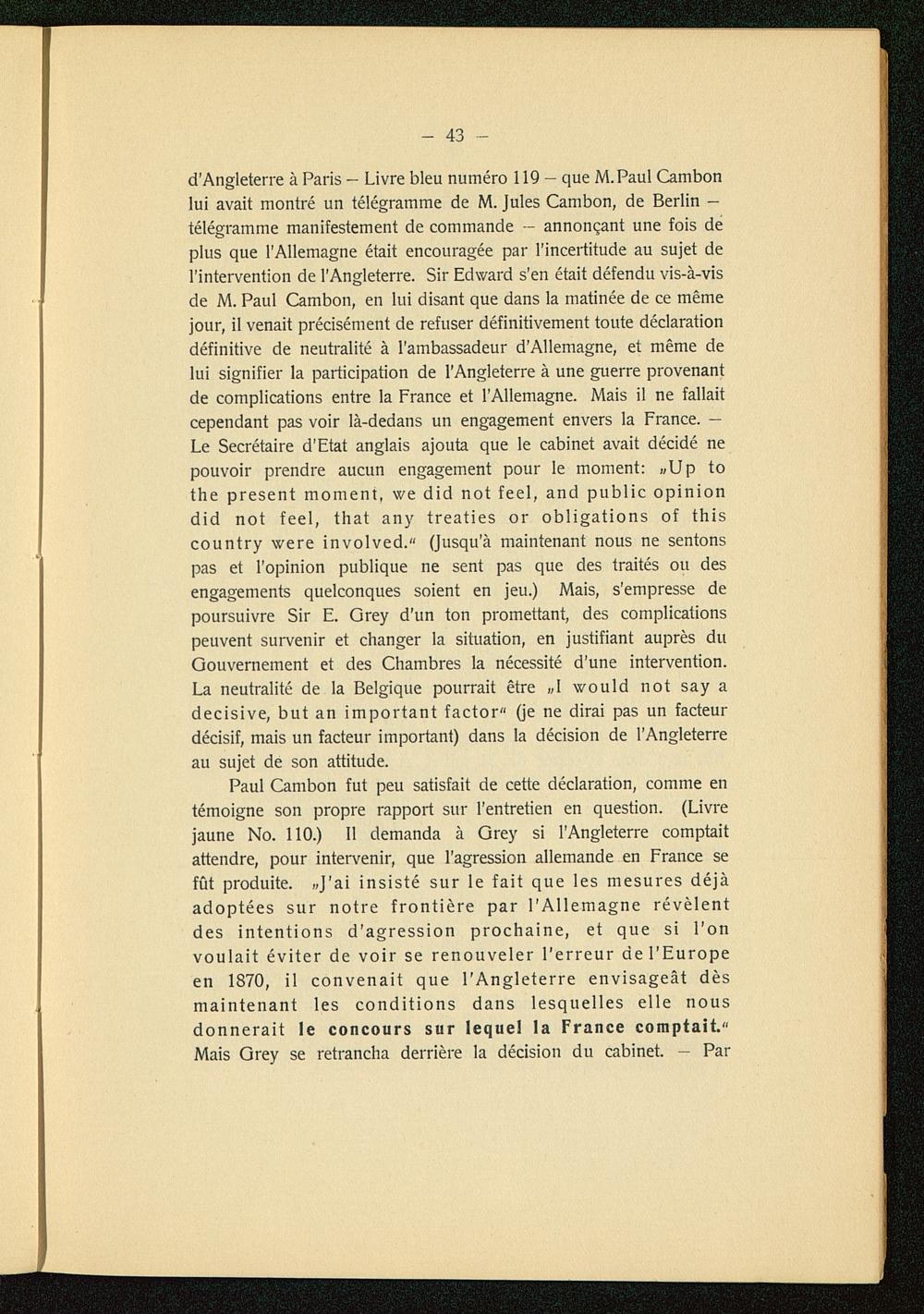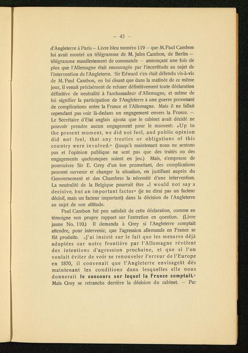 d'Angleterre à Paris — Livre bleu numéro 119 - que M.Paul Cambon lui avait montré un télégramme de M. Jules Cambon, de Berlin -télégramme manifestement de commande - annonçant une fois deplus que l'Allemagne était encouragée par l'incertitude au sujet del'intervention de l'Angleterre . Sir Edward s'en était défendu vis-à-visde M. Paul Cambon , en lui disant que dans la matinée de ce mêmejour, il venait précisément de refuser définitivement toute déclarationdéfinitive de neutralité à l'ambassadeur d'Allemagne , et même delui signifier la participation de l'Angleterre à une guerre provenantde complications entre la France et l'Allemagne . Mais il ne fallaitcependant pas voir là-dedans un engagement envers la France . —Le Secrétaire d'Etat anglais ajouta que le cabinet avait décidé nepouvoir prendre aucun engagement pour le moment: «Up tothe present moment, we did not feel, and public opiniondid not feel, that any treaties or obligations of thiscountry were involved." (Jusqu'à maintenant nous ne sentonspas et l'opinion publique ne sent pas que des traités ou desengagements quelconques soient en jeu.) Mais, s'empresse depoursuivre Sir E. Grey d'un ton promettant , des complicationspeuvent survenir et changer la situation, en justifiant auprès duGouvernement et des Chambres la nécessité d'une intervention.La neutralité de la Belgique pourrait être »I would not say adecisive, but an important factor" (je ne dirai pas un facteurdécisif, mais un facteur important) dans la décision de l'Angleterre au sujet de son attitude.