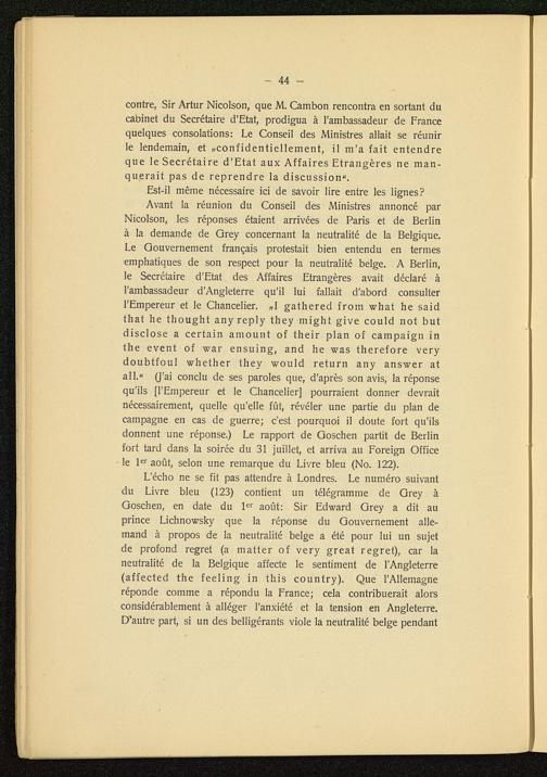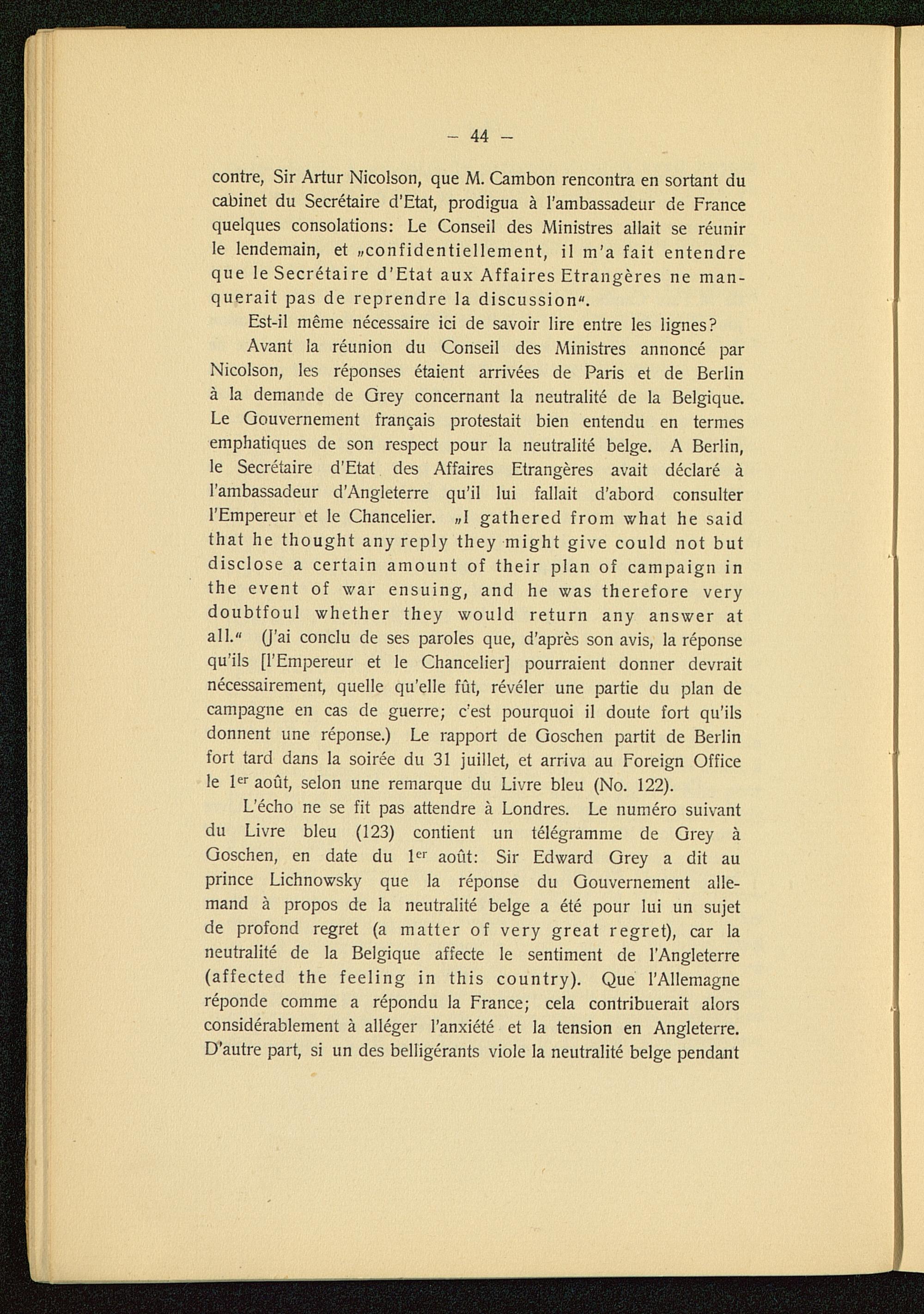 Avant la réunion du Conseil des Ministres annoncé parNicolson, les réponses étaient arrivées de Paris et de Berlin à la demande de Grey concernant la neutralité de la Belgique .Le Gouvernement français protestait bien entendu en termesemphatiques de son respect pour la neutralité belge. A Berlin ,le Secrétaire d'Etat des Affaires Etrangères avait déclaré àl'ambassadeur d'Angleterre qu'il lui fallait d'abord consulterl'Empereur et le Chancelier. „I gathered from what he saidthat he thought any reply they might give could not butdisclose a certain amount of their plan of campaign inthe event of war ensuing, and he was therefore verydoubtfoul whether they would return any answer atall." (J'ai conclu de ses paroles que, d'après son avis, la réponsequ'ils [l'Empereur et le Chancelier] pourraient donner devraitnécessairement, quelle qu'elle fût, révéler une partie du plan decampagne en cas de guerre; c'est pourquoi il doute fort qu'ilsdonnent une réponse.) Le rapport de Goschen partit de Berlin fort tard dans la soirée du 31 juillet, et arriva au Foreign Officele 1 er août, selon une remarque du Livre bleu (No. 122).