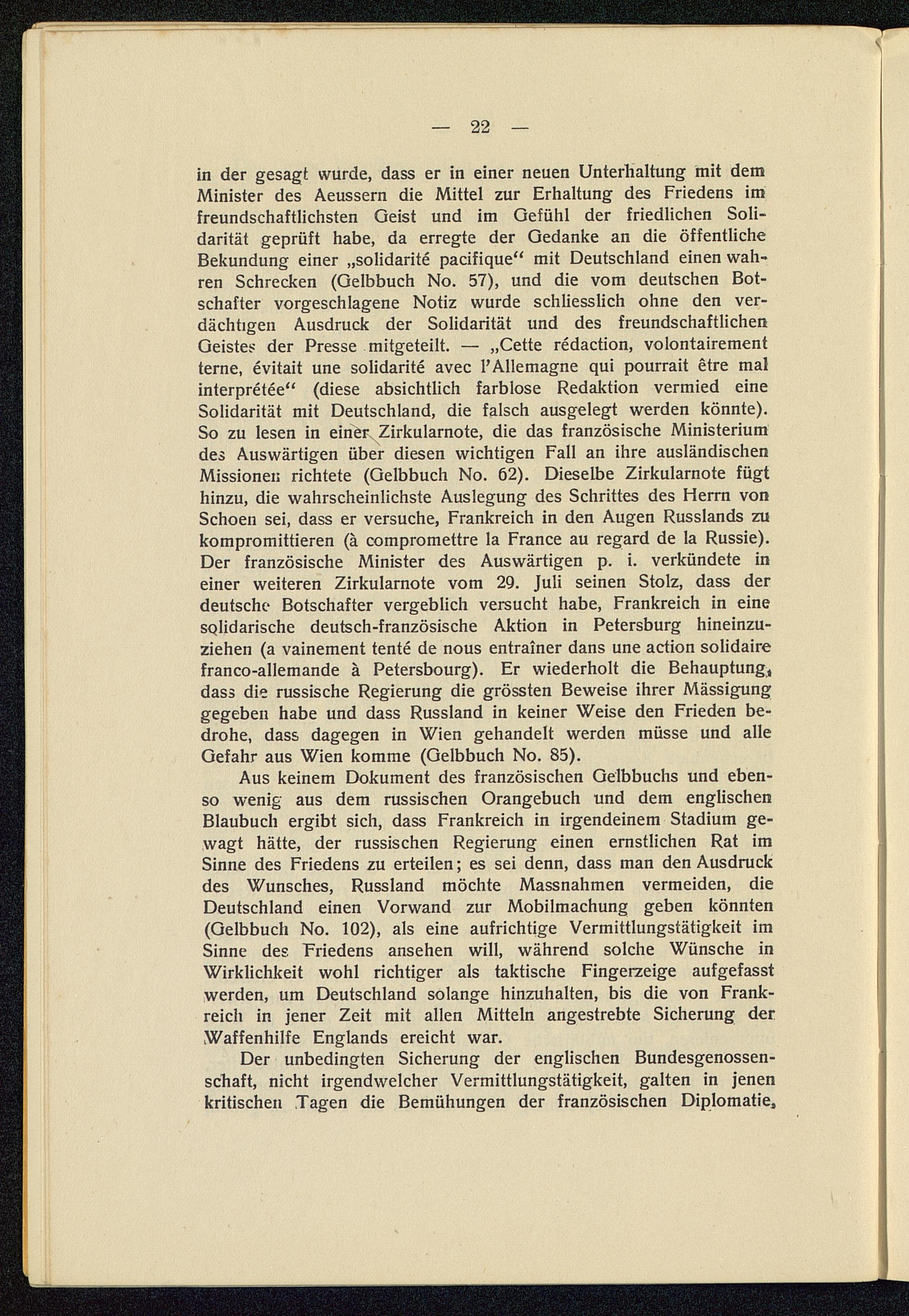 in der gesagt wurde, dass er in einer neuen Unterhaltung mit demMinister des Aeussern die Mittel zur Erhaltung des Friedens imfreundschaftlichsten Geist und im Gefühl der friedlichen Soli-darität geprüft habe, da erregte der Gedanke an die öffentlicheBekundung einer „solidarité pacifique" mit Deutschland einen wah-ren Schrecken (Gelbbuch No. 57), und die vom deutschen Bot-schafter vorgeschlagene Notiz wurde schliesslich ohne den ver-dächtigen Ausdruck der Solidarität und des freundschaftlichenGeistes der Presse mitgeteilt. — „Cette rédaction, volontairementterne, évitait une solidarité avec l'Allemagne qui pourrait être malinterprétée" (diese absichtlich farblose Redaktion vermied eineSolidarität mit Deutschland , die falsch ausgelegt werden könnte).So zu lesen in einer Zirkularnote, die das französische Ministeriumdes Auswärtigen über diesen wichtigen Fall an ihre ausländischenMissionen richtete (Gelbbuch No. 62). Dieselbe Zirkularnote fügthinzu, die wahrscheinlichste Auslegung des Schrittes des Herrn vonSchoen sei, dass er versuche, Frankreich in den Augen Russlands zukompromittieren (à compromettre la France au regard de la Russie).Der französische Minister des Auswärtigen p. i. verkündete ineiner weiteren Zirkularnote vom 29. Juli seinen Stolz, dass derdeutsche Botschafter vergeblich versucht habe, Frankreich in einesolidarische deutsch-französische Aktion in Petersburg hineinzu-ziehen (a vainement tenté de nous entraîner dans une action solidairefranco-allemande à Petersbourg ). Er wiederholt die Behauptung,dass die russische Regierung die grössten Beweise ihrer Mässigunggegeben habe und dass Russland in keiner Weise den Frieden be-drohe, dass dagegen in Wien gehandelt werden müsse und alleGefahr aus Wien komme (Gelbbuch No. 85).