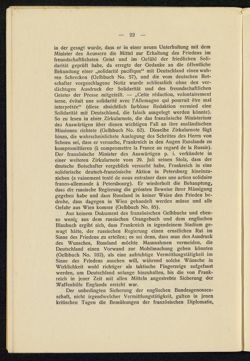 Aus keinem Dokument des französischen Gelbbuchs und eben-so wenig aus dem russischen Orangebuch und dem englischenBlaubuch ergibt sich, dass Frankreich in irgendeinem Stadium ge-wagt hätte, der russischen Regierung einen ernstlichen Rat imSinne des Friedens zu erteilen ; es sei denn, dass man den Ausdruckdes Wunsches, Russland möchte Massnahmen vermeiden, dieDeutschland einen Vorwand zur Mobilmachung geben könnten(Gelbbuch No. 102), als eine aufrichtige Vermittlungstätigkeit imSinne des Friedens ansehen will, während solche Wünsche inWirklichkeit wohl richtiger als taktische Fingerzeige aufgefasstwerden, um Deutschland solange hinzuhalten, bis die von Frank-reich in jener Zeit mit allen Mitteln angestrebte Sicherung derWaffenhilfe Englands ereicht war.