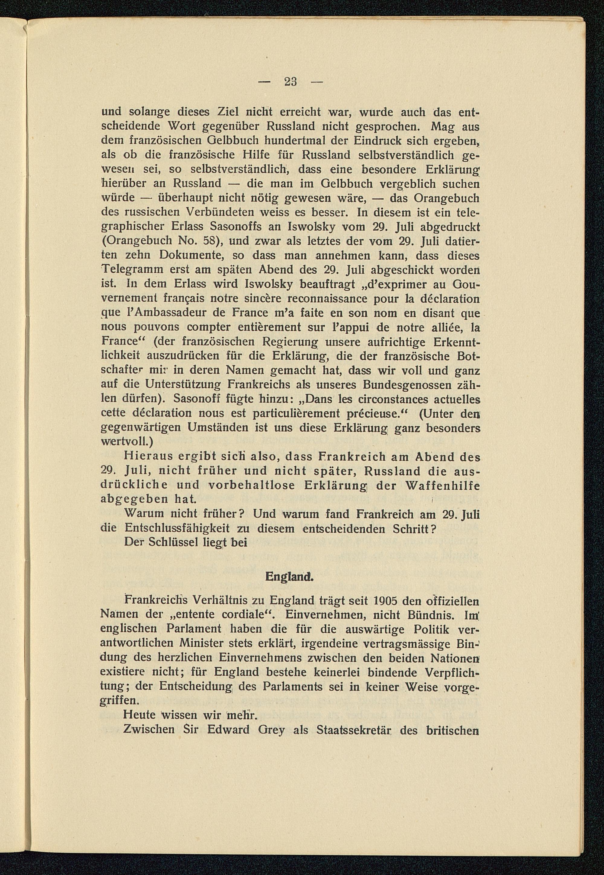 Hieraus ergibt sich also, dass Frankreich am Abend des29. Juli, nicht früher und nicht später, Russland die aus-drückliche und vorbehaltlose Erklärung der Waffenhilfeabgegeben hat. i