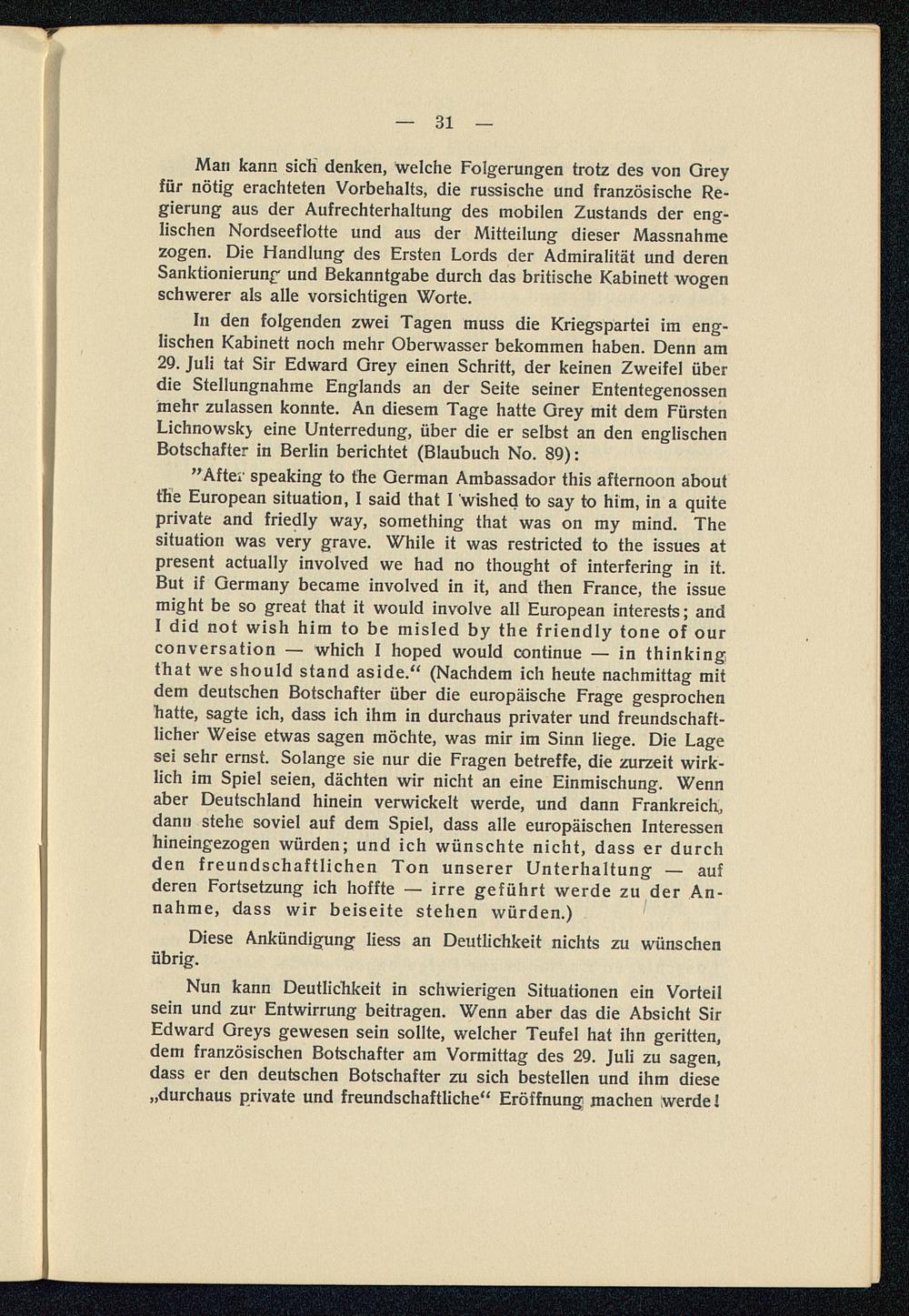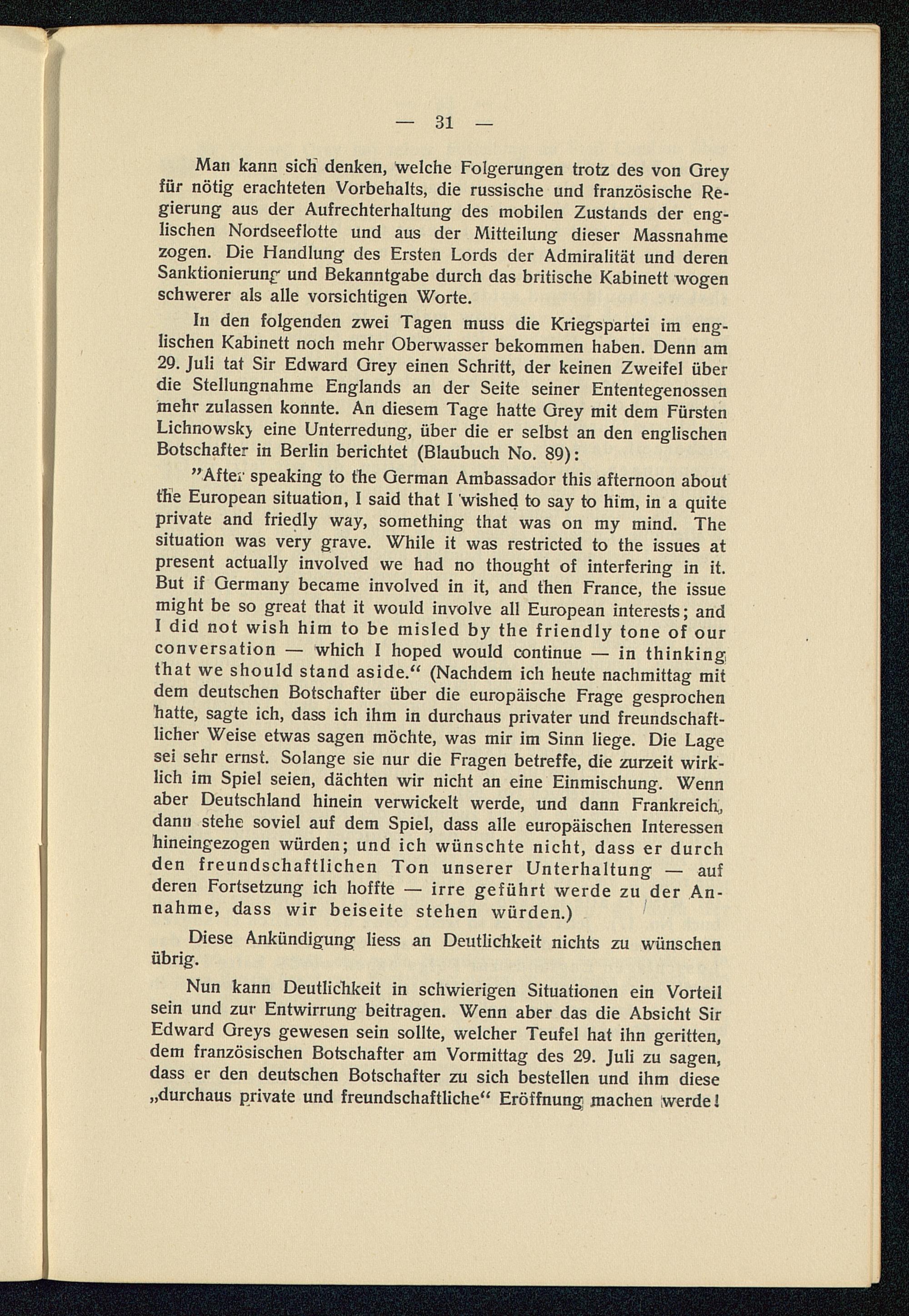 In den folgenden zwei Tagen muss die Kriegspartei im eng-lischen Kabinett noch mehr Oberwasser bekommen haben. Denn am29. Juli tat Sir Edward Grey einen Schritt, der keinen Zweifel überdie Stellungnahme Englands an der Seite seiner Ententegenossenmehr zulassen konnte. An diesem Tage hatte Grey mit dem FürstenLichnowskj eine Unterredung, über die er selbst an den englischenBotschafter in Berlin berichtet (Blaubuch No. 89):