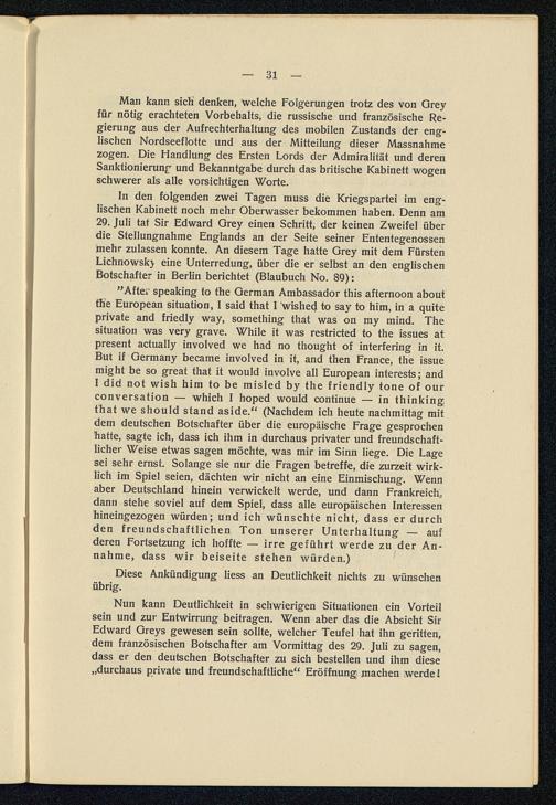 "After speaking to the German Ambassador this afternoon aboutthe European situation, I said that I wished to say to him, in a quiteprivate and friedly way, something that was on my mind. Thesituation was very grave. While it was restricted to the issues atpresent actually involved we had no thought of interfering in it.But if Germany became involved in it, and then France, the issuemight be so great that it would involve all European interests; andI did not wish him to be misled by the friendly tone of ourconversation — which I hoped would continue — in thinkingthat we should stand aside." (Nachdem ich heute nachmittag mitdem deutschen Botschafter über die europäische Frage gesprochenhatte, sagte ich, dass ich ihm in durchaus privater und freundschaft-licher Weise etwas sagen möchte, was mir im Sinn liege. Die Lagesei sehr ernst. Solange sie nur die Fragen betreffe, die zurzeit wirk-lich im Spiel seien, dächten wir nicht an eine Einmischung. Wennaber Deutschland hinein verwickelt werde, und dann Frankreich ,dann stehe soviel auf dem Spiel, dass alle europäischen Interessenhineingezogen würden; und ich wünschte nicht, dass er durchden freundschaftlichen Ton unserer Unterhaltung — aufderen Fortsetzung ich hoffte — irre geführt werde zu der An-nahme, dass wir beiseite stehen würden.)